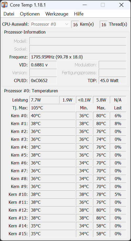 Im Cinebench R23 erreichte der M1 Pro 17 271 Punkte im Multi-Core-Test und 2 180 Punkte im Single-Core-Test. Damit liegt der kompakte Rechner auf dem Niveau eines Desktop-Core i9 der vorherigen Generation, arbeitet aber spürbar effizienter. Über den gesamten Testzeitraum blieben die Taktraten stabil, und die Temperatur bewegte sich konstant um 80 Grad Celsius – ein Hinweis auf ein sauberes Power- und Thermal-Management.