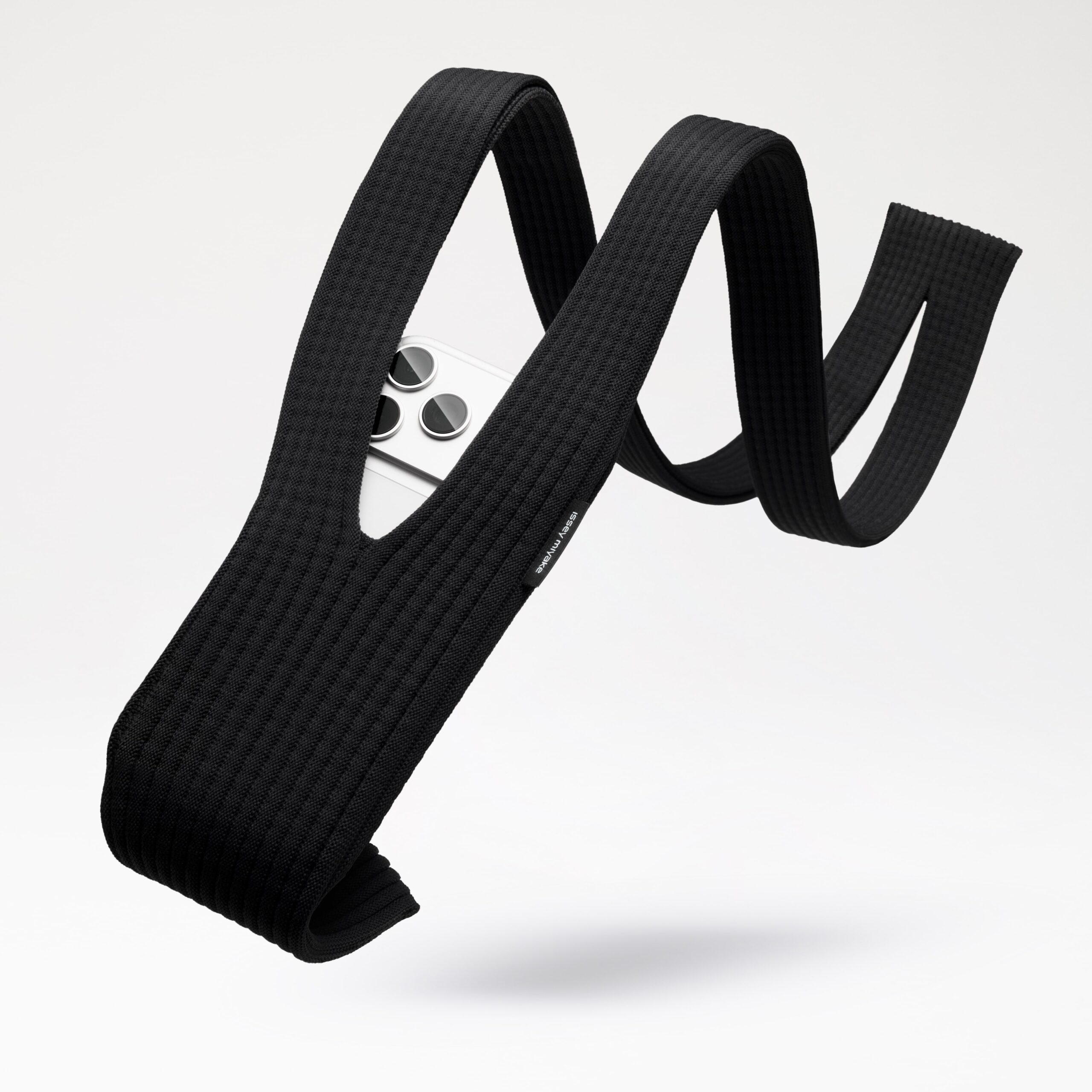 Gefertigt wird das iPhone Pocket in Japan. Das Material stammt aus einem speziellen 3D-Strickverfahren, das an die bekannten Plissee-Stoffe von ISSEY MIYAKE erinnert. Der Stoff wirkt zunächst kompakt, dehnt sich aber bei Gebrauch leicht aus und legt sich eng um das iPhone. Durch die leicht offene Struktur lässt sich das Display auch unterwegs kurz einsehen – ein kleines, aber durchdachtes Detail.