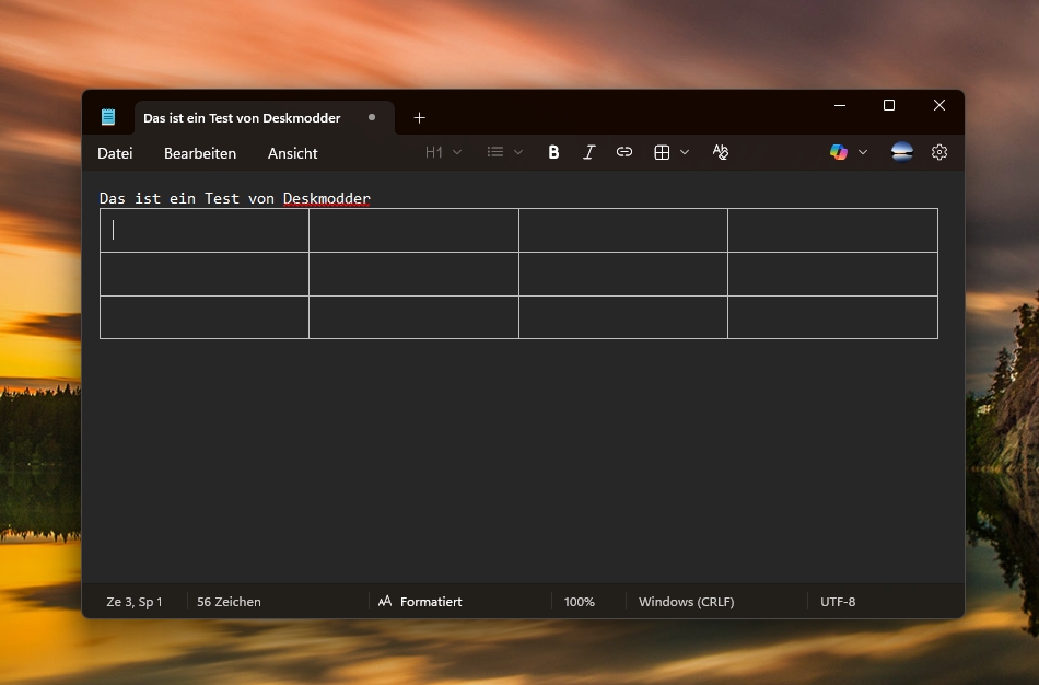 Der Editor (Notepad) wurde inzwischen schon mit einigen guten Funktionen ausgerüstet. So unter andere, die Formatierung mit Überschriften, Fettschrift, Kursiv und weiteres. Im Editor mit der Version 11.2510.6.0 wird eine weitere Funktion hinzugefügt. Tabellen in die Textdatei einfügen.