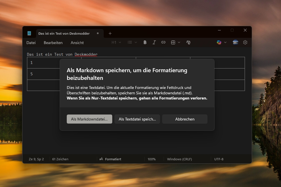 Aktuell wird diese Funktion an die Insider über die Store Updates ausgeliefert. Aber auch in der Retail kann diese neue Funktion schon ausprobiert werden. Man muss nur darauf achten, dass man beim Speichern der Datei Markdown auswählt, ansonsten ist die Formatierung „hinüber“. Die Datei wird dann auch als *.md und nicht als *.txt abgespeichert. *.md kann aber jeder gute Editor öffnen.