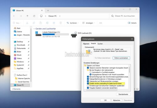Eine weitere neue Funktion ist in der Beta/Dev auch noch hinzugekommen. Das Vorladen der Explorer.exe. Kennen wir ja unter anderem vom Microsoft Edge, oder auch schon von Office 95 (Vorladen der DLLs). Dadurch soll oder wird das Fenster vom Datei Explorer dann schneller geöffnet. Ob dies auch zutrifft, wenn ein Netzwerk im Spiel ist, kann ich selbst nicht testen. Wer es nicht mag, hat die Möglichkeit, die Funktion in den Ordneroptionen zu deaktivieren.
