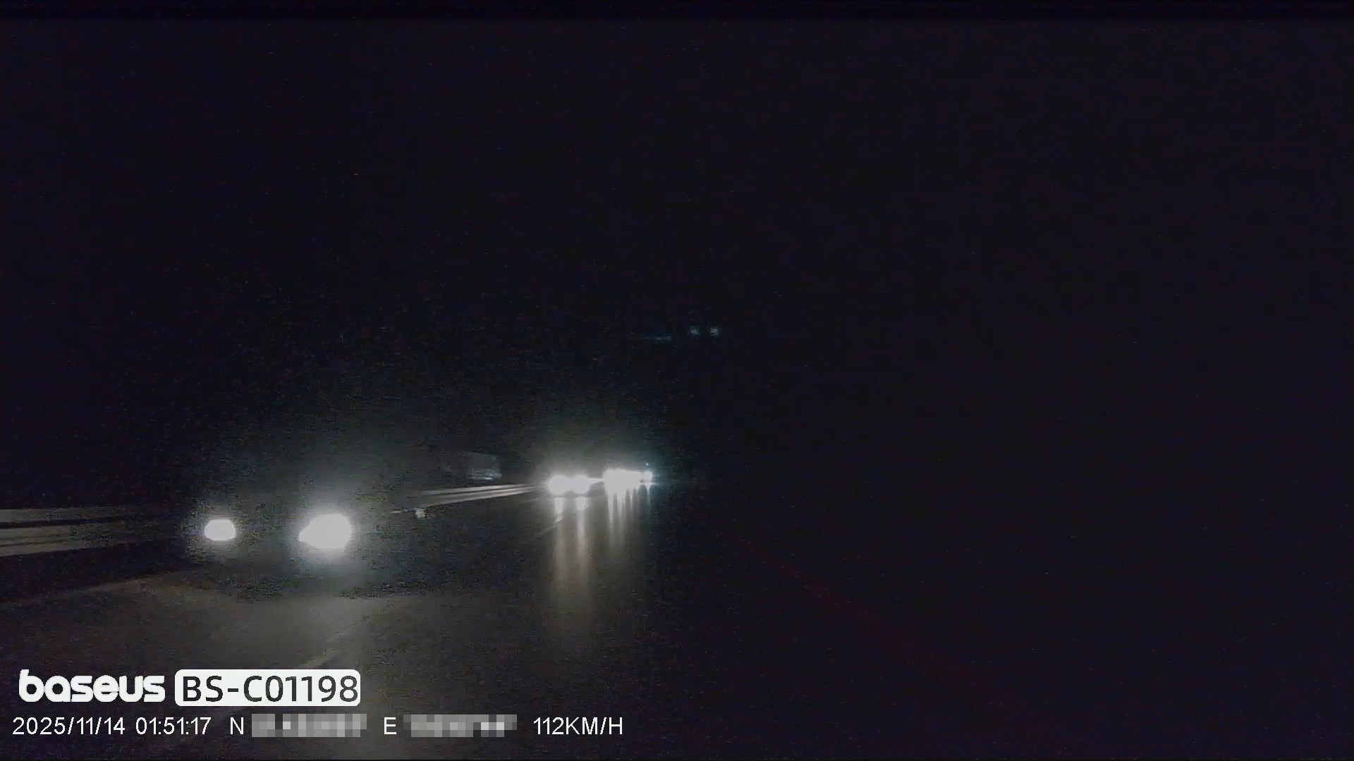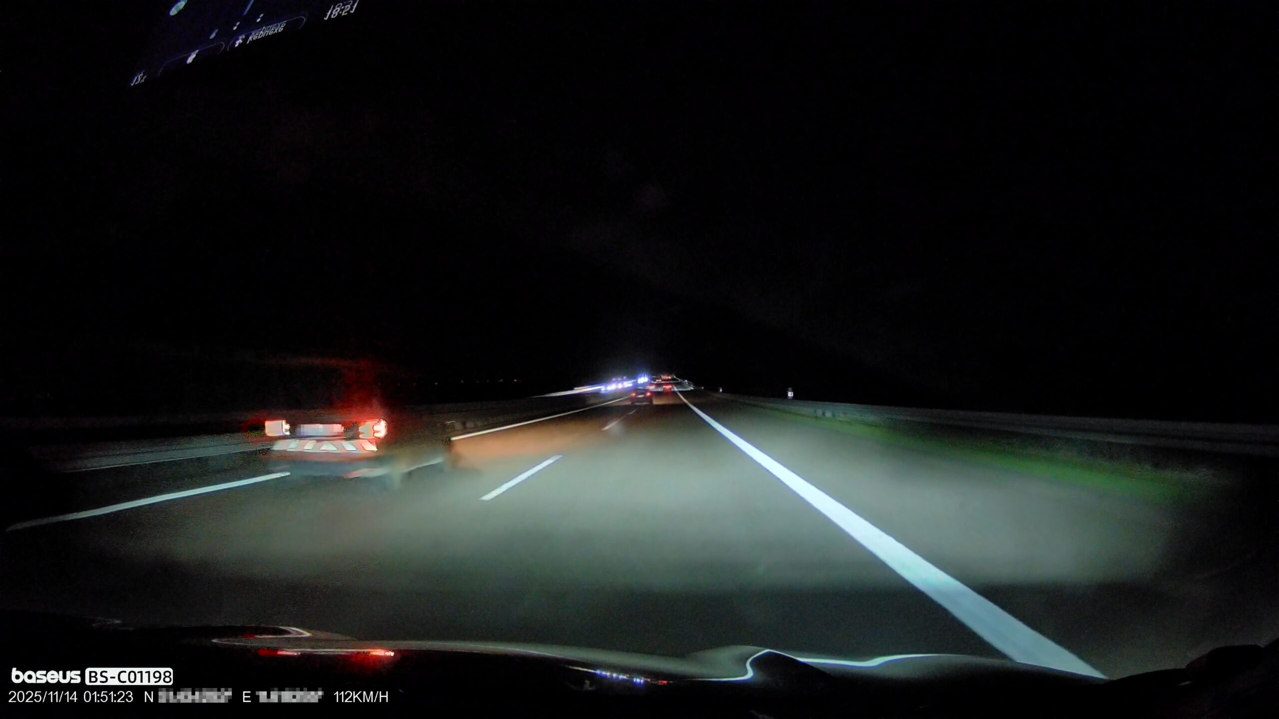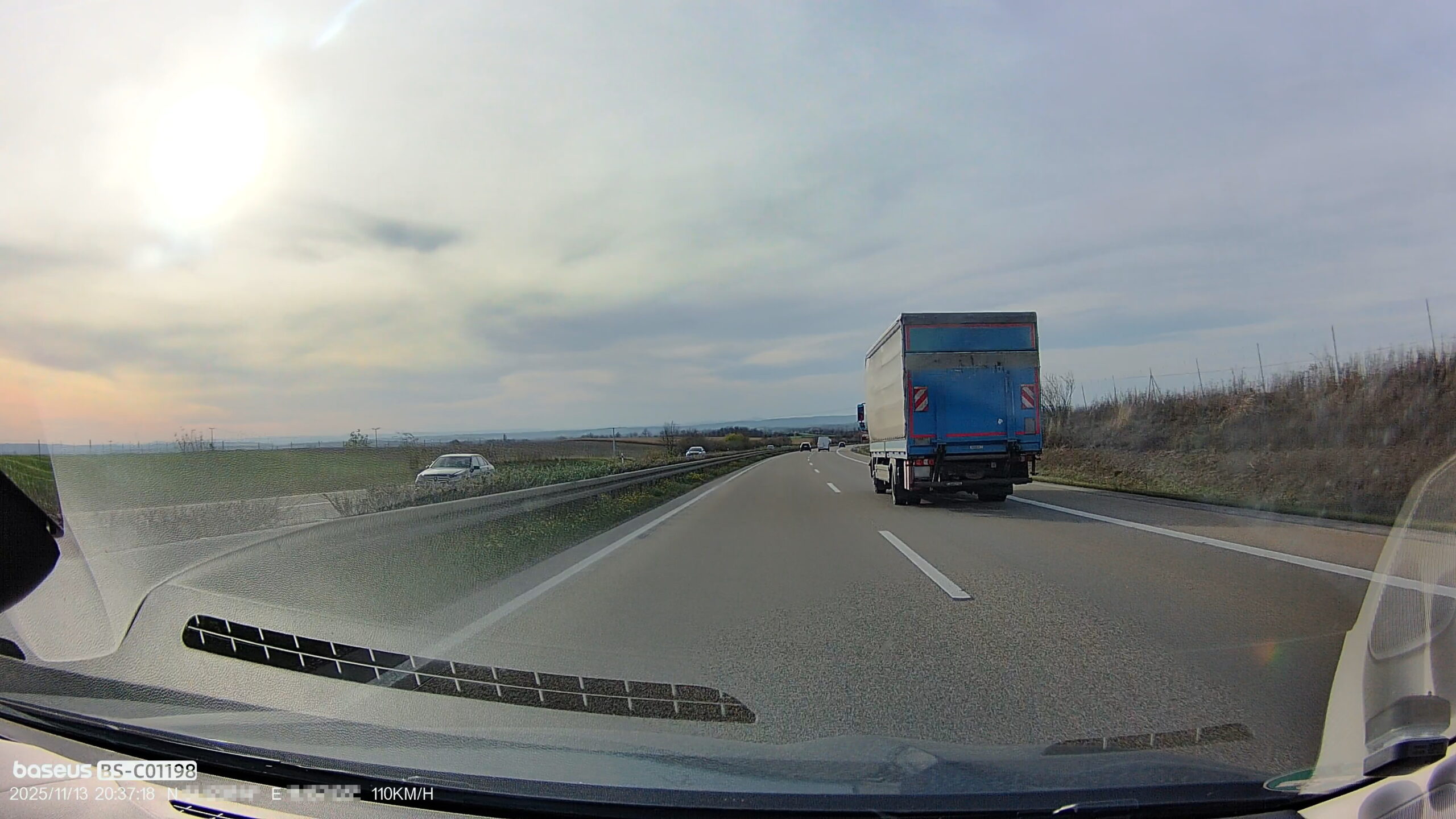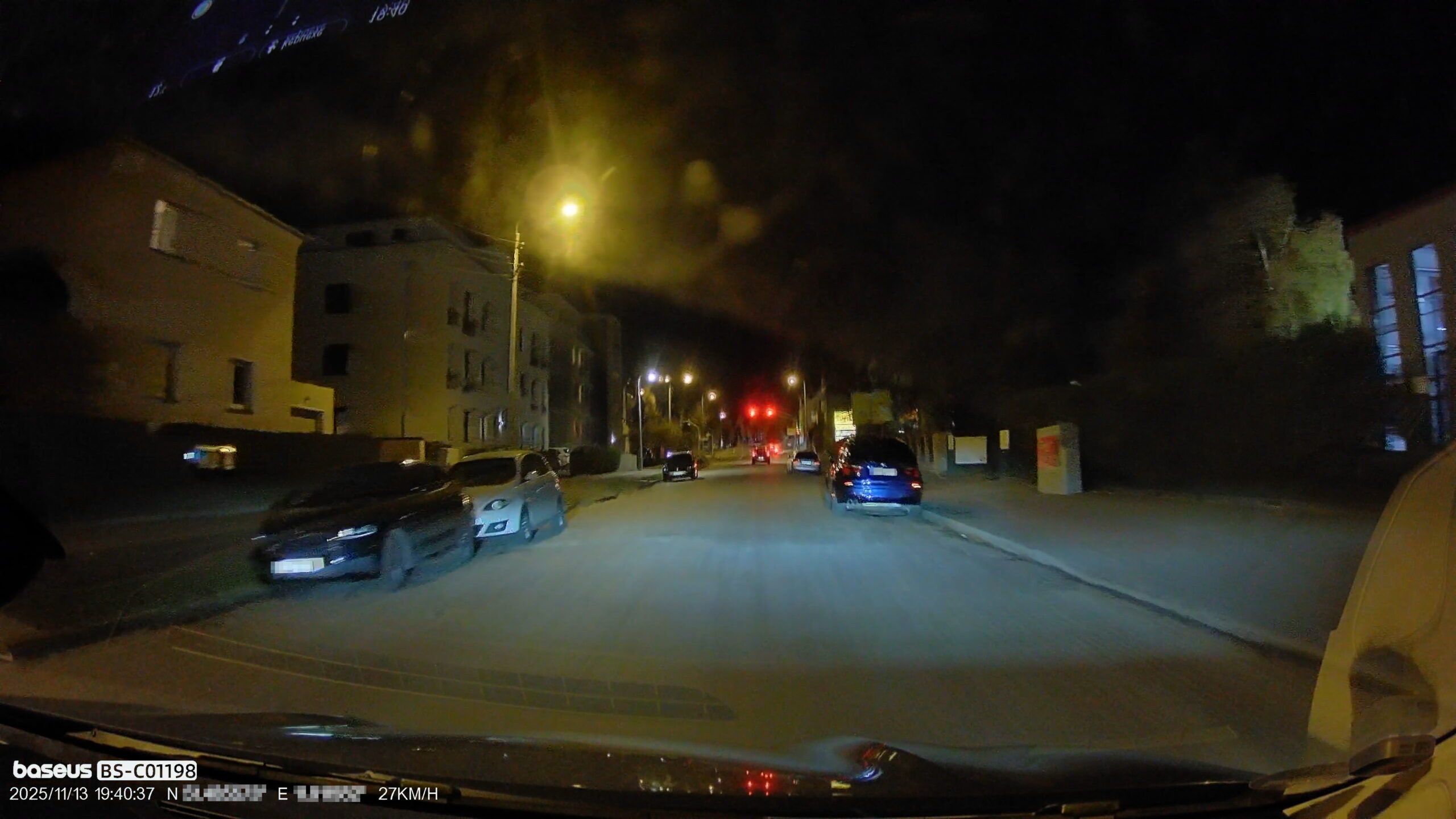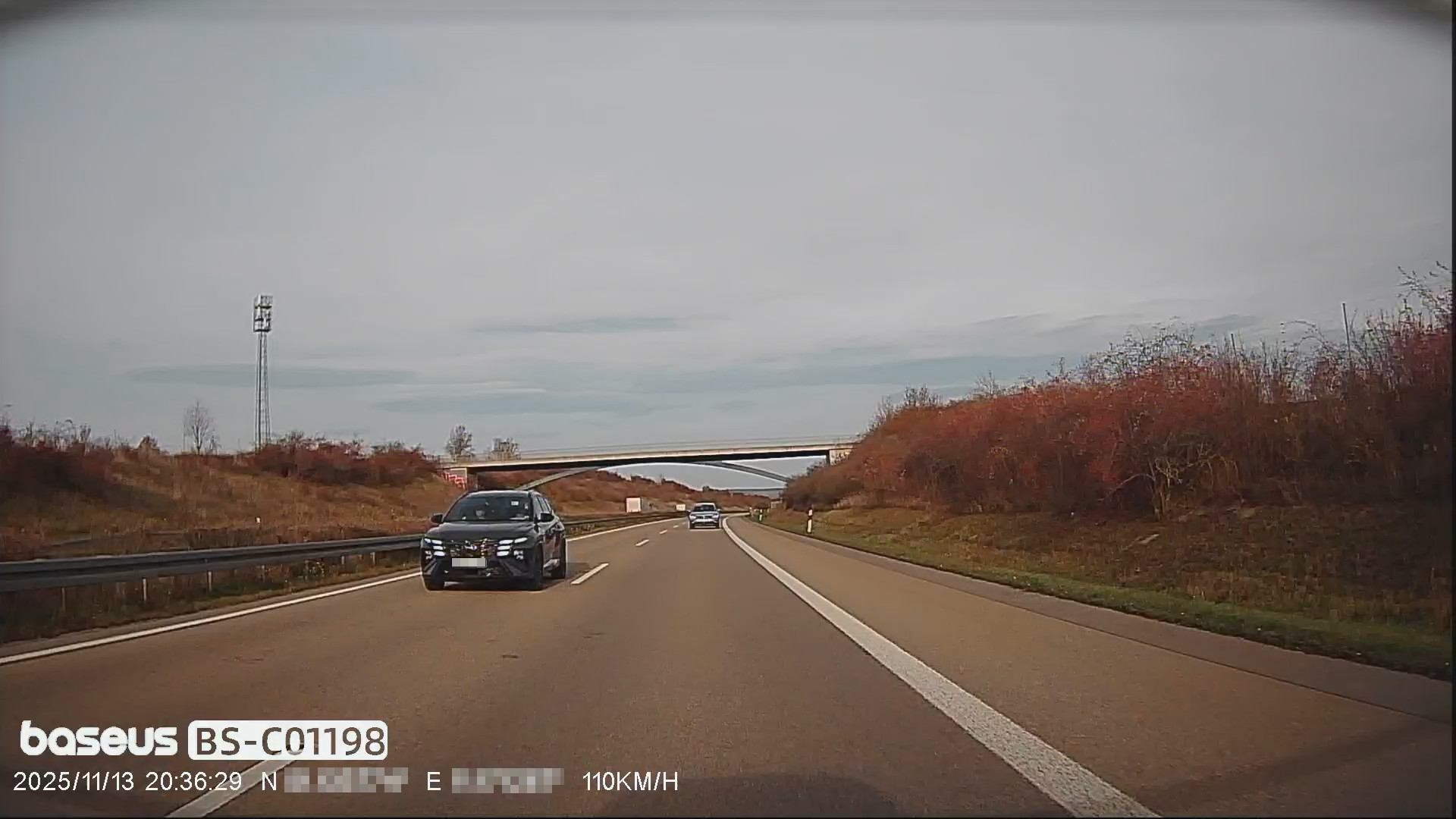 Baseus bewirbt die vordere Dashcam mit dem Sony Starvis IMX335 Sensor, der insbesondere bei schlechten Lichtverhältnissen glänzen soll. Die Qualität bei Tageslicht geht vollkommen in Ordnung, selbst bei Gegenlicht versuchte die Kamera keinerlei wirren Helligkeitsexperimente, um alle wichtigen Details erkennen zu können. Dennoch hat auch sie es zu später Stunde schwer, im Dunkeln alles gut zu sehen, ohne dass das Bild zu krass verrauscht wirkt. Sie bemüht sich dennoch, zumindest die Kennzeichen der umliegenden Fahrzeuge hervorzustechen. Mit 140° Weitwinkel (plus 30° seitlich) wird definitiv einiges mit ins Visier genommen.
