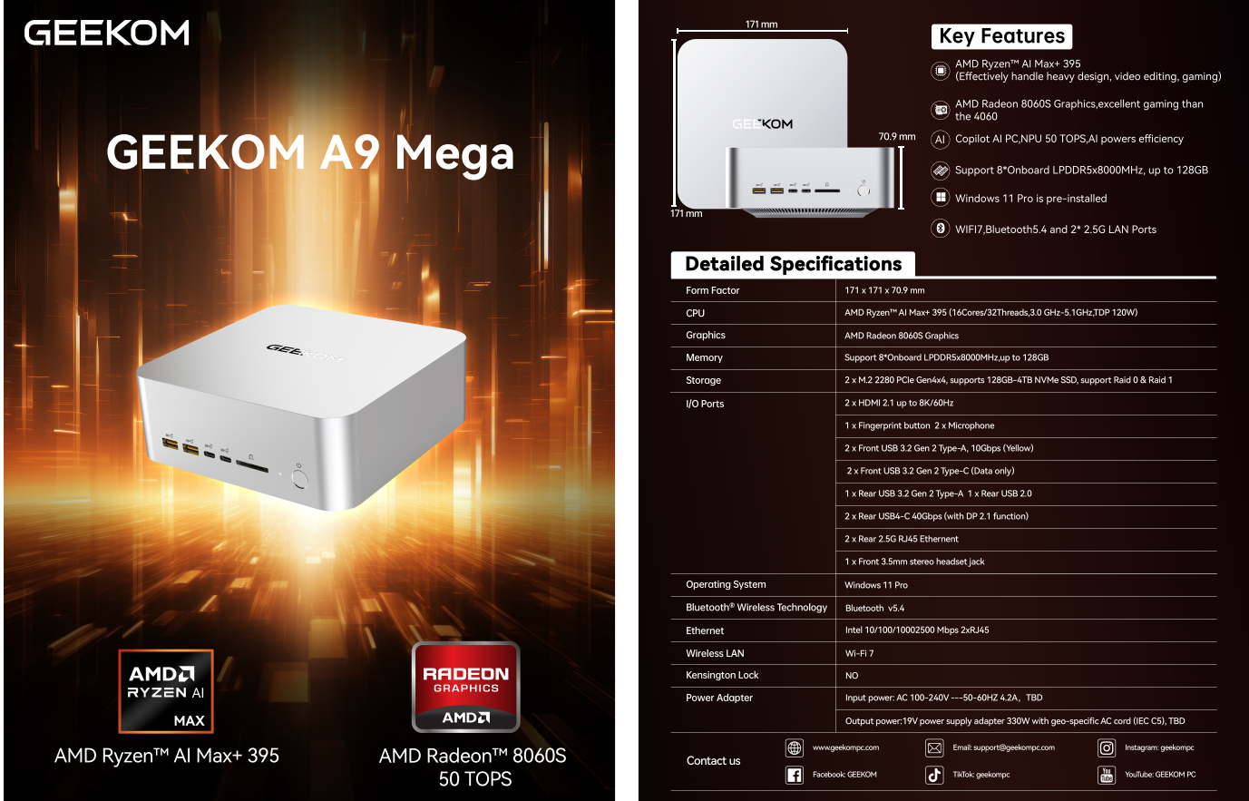 • AMD Ryzen AI Max+ 395 (16 Kerne, 32 Threads, bis 5,1 GHz, TDP 120W) mit AMD Radeon 8060S Graphics (50 TOPS)