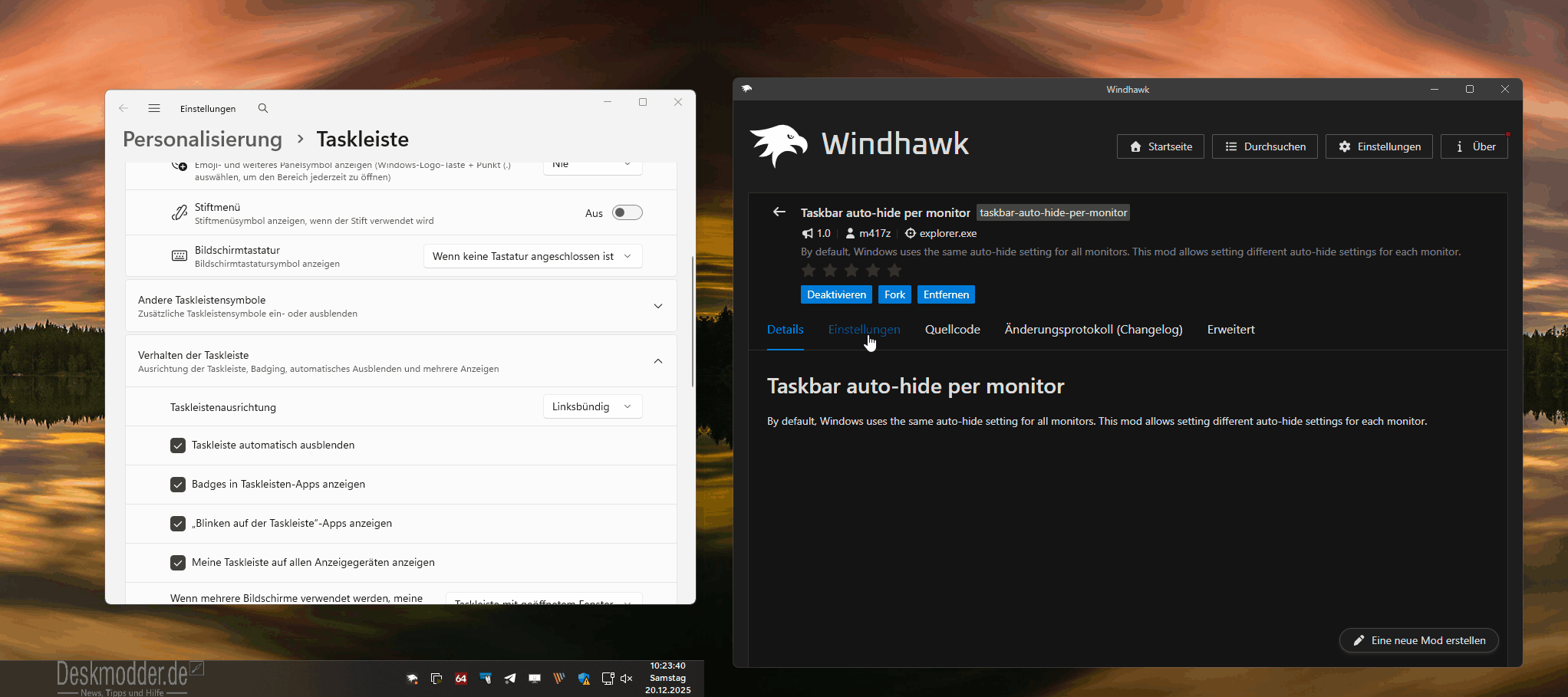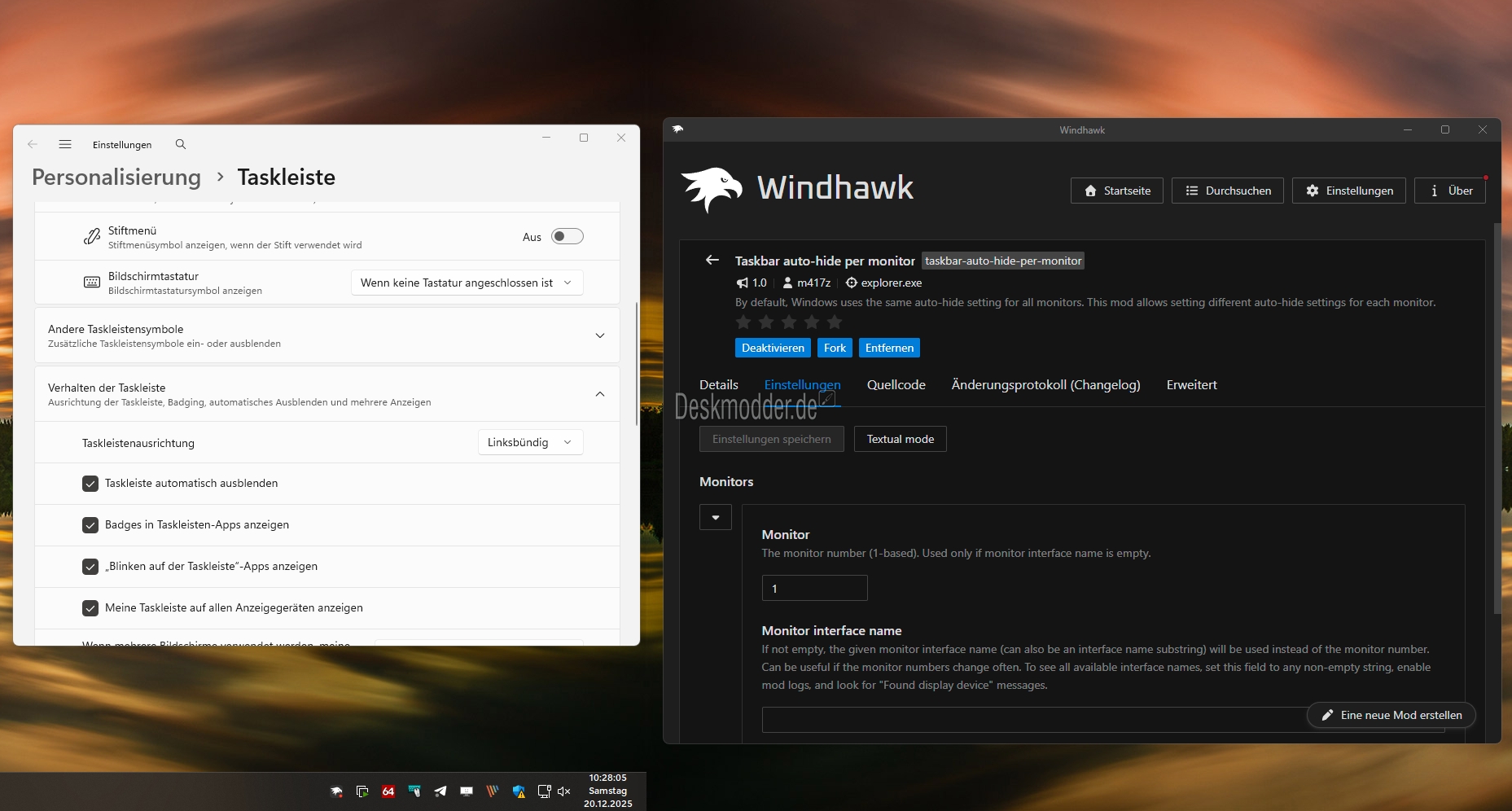 Wer mehrere Monitore hat und gerne die Taskleiste ausblendet, kennt das Problem. Entweder es werden unter Windows 11 alle Taskleisten eingeblendet oder ausgeblendet. Dafür gibt es jetzt aber Abhilfe, mit einem Windhawk-Mod mit dem Namen „Taskbar auto-hide per monitor“.