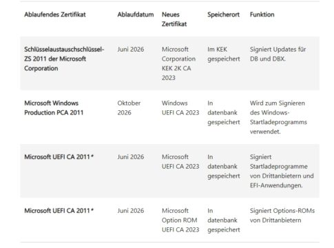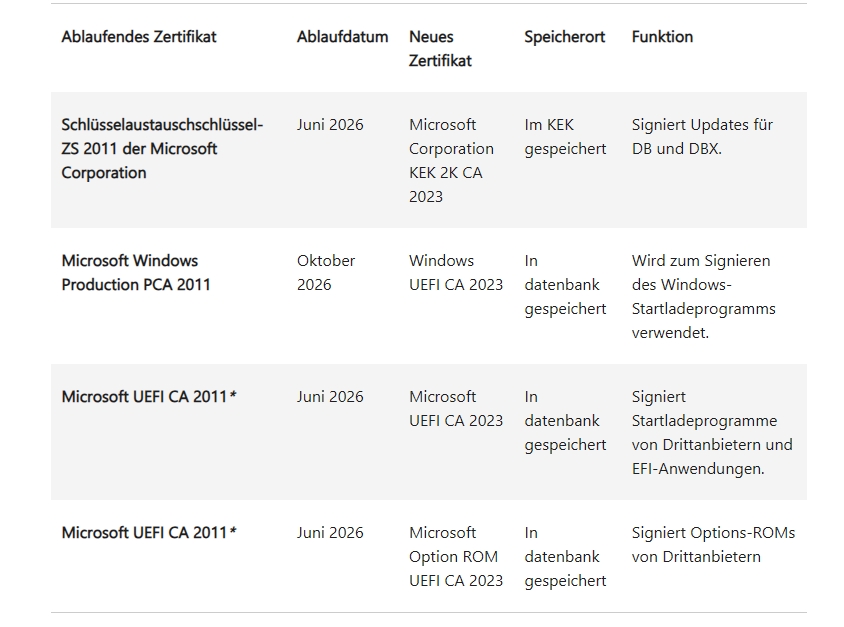 - Wird das Zertifikat nicht erneuert, werden auch keine sicherheitsrelevanten Updates für den Boot-Manager oder Secure Boot installiert.