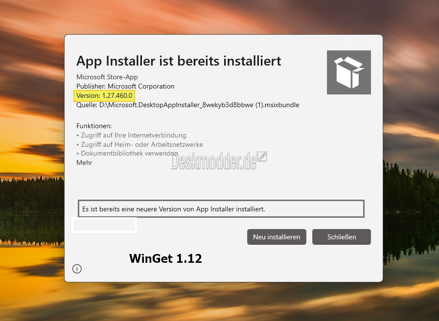 Mit dem Sprung von der Version 1.12 auf die 1.28 will man endlich die Versionsangabe zwischen Winget und dem App Installer vornehmen. Hier kam es in der Vergangenheit immer mal wieder zu Irritationen. Mit der 1.28 wird dies dann ad acta gelegt. Hier mal das Bild von der Installation von WinGet 1.12.