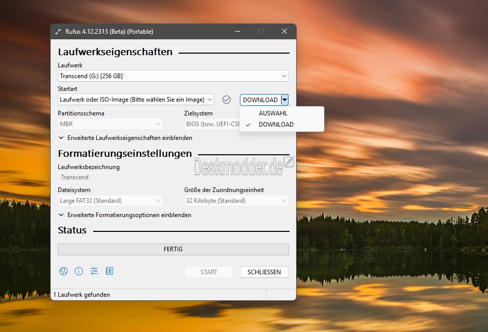 - Die rufus-4.12_BETA.exe kann in rufus-4.12p.exe für eine portable Nutzung umbenannt werden