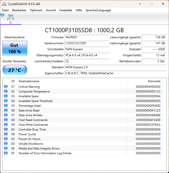 Als Systemlaufwerk dient eine NVMe-SSD mit PCIe-4.0-Anbindung. Die gemessenen Transferraten von rund 5,7 GB/s beim Lesen und 5,4 GB/s beim Schreiben liegen auf einem sehr hohen Niveau. Auch die 4K-Werte und Zugriffszeiten überzeugen. In der Praxis äußert sich das in kurzen Ladezeiten, zügigem Projektwechsel und einem insgesamt sehr reaktionsschnellen System – unabhängig davon, ob mit großen Datenmengen oder vielen parallelen Anwendungen gearbeitet wird.