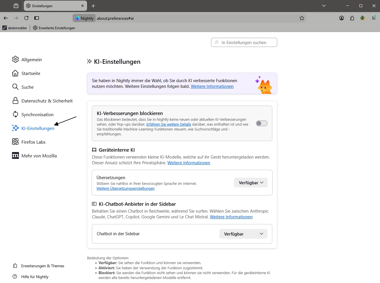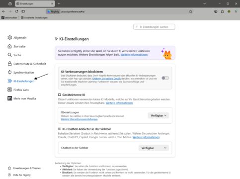Die Funktion, um die künstliche Intelligenz komplett in den Einstellungen zu deaktivieren, kommt erst mit dem Firefox 148, der am 24.02. erscheinen wird. Das wird dann so aussehen (derzeit Nightly bei mir).