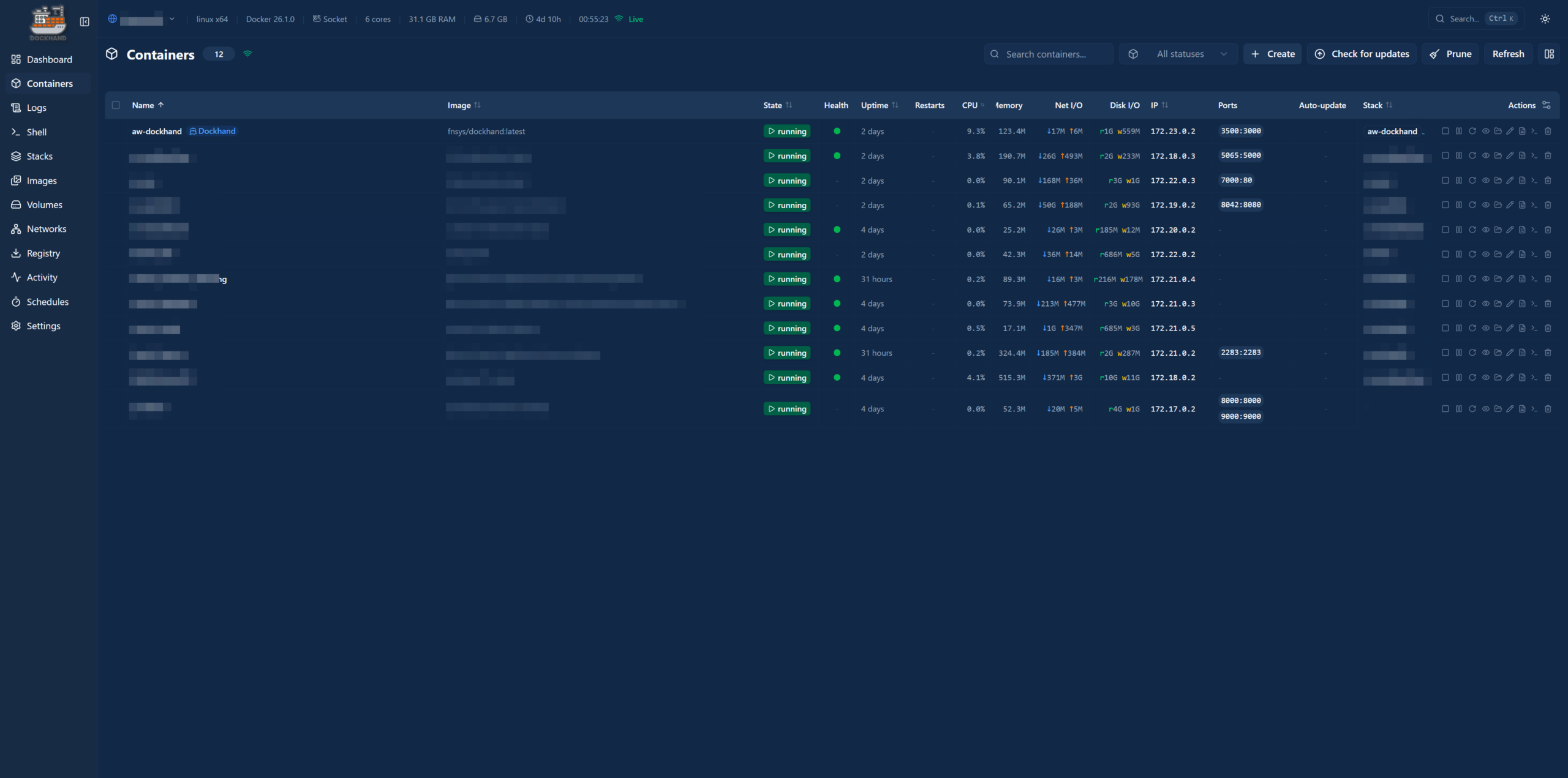 In der Container-Ansicht listet Dockhand alle laufenden Dienste übersichtlich auf. Neben Name und Image werden Laufzeit, Ressourcennutzung, Netzwerk-Informationen und freigegebene Ports angezeigt. Auffälligkeiten lassen sich schnell erkennen, etwa wenn ein Container ungewöhnlich viel Speicher belegt oder häufig neu startet.