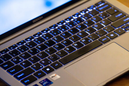 Das Layout ist logisch, die Hintergrundbeleuchtung gleichmäßig und unaufdringlich. Es gibt keine Experimente, keine versetzten Tasten, keine unnötigen Abkürzungen. Genau das ist bei einem Arbeitsnotebook ein Vorteil. Einzig ein Nummernblock fehlt dem GeekBook X14 Pro aufgrund seiner Größe. Dies gleicht jedoch die größere Version – das GeekBook X16 Pro – aus.