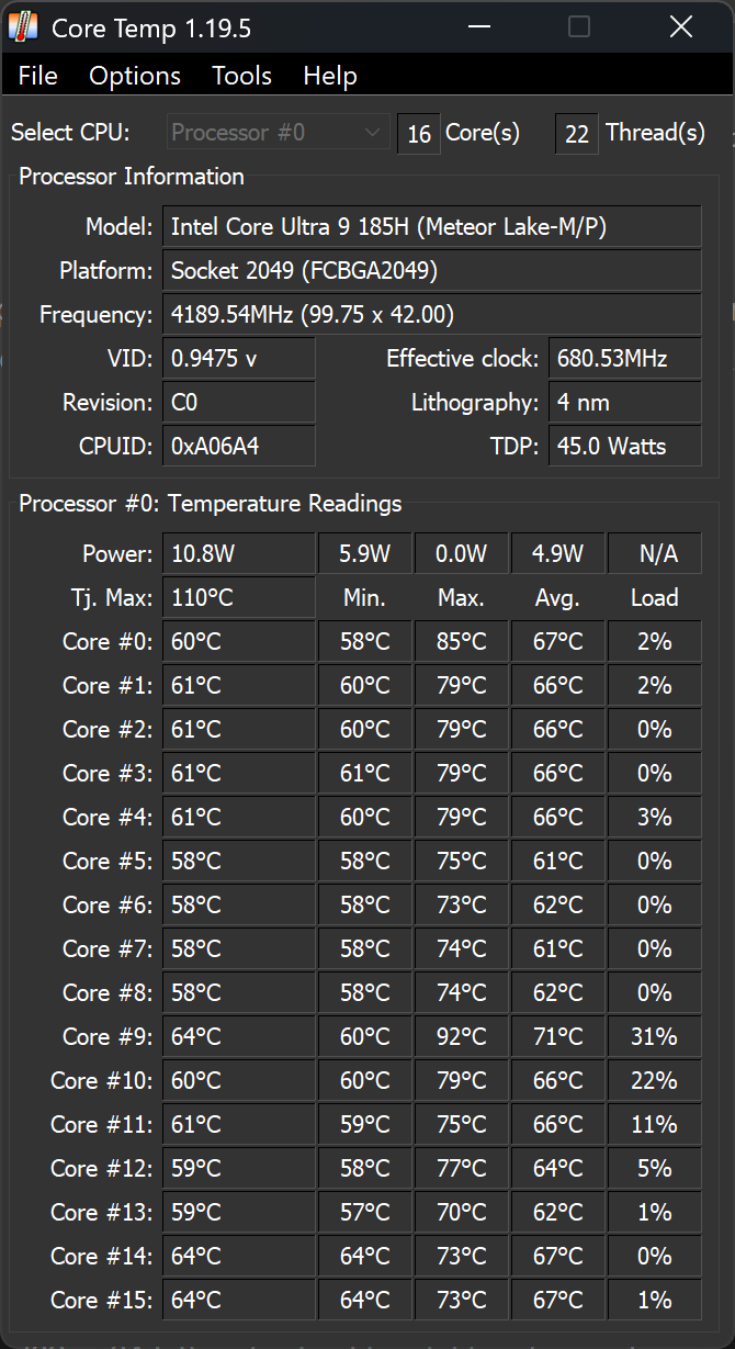 Im Inneren arbeitet in unserem Testgerät der Intel Core Ultra 9 185H, ein Vertreter der ersten Core-Ultra-Generation (Meteor Lake). Intel verfolgt mit dieser Plattform einen anderen Ansatz als bei früheren Prozessoren. Statt reiner Spitzenleistung stehen Effizienz, Funktionsintegration und ein möglichst breites Einsatzspektrum im Vordergrund. Neben den klassischen CPU-Kernen kommen eine integrierte Arc-Grafik sowie eine dedizierte NPU zum Einsatz, die perspektivisch KI-Workloads übernehmen soll. Das GeekBook fühlt sich damit nicht wie ein klassisches Ultrabook an, sondern eher wie ein sehr kompaktes Arbeitsgerät, das bei Bedarf Leistung bereitstellt, ohne dauerhaft an thermische Grenzen zu stoßen.