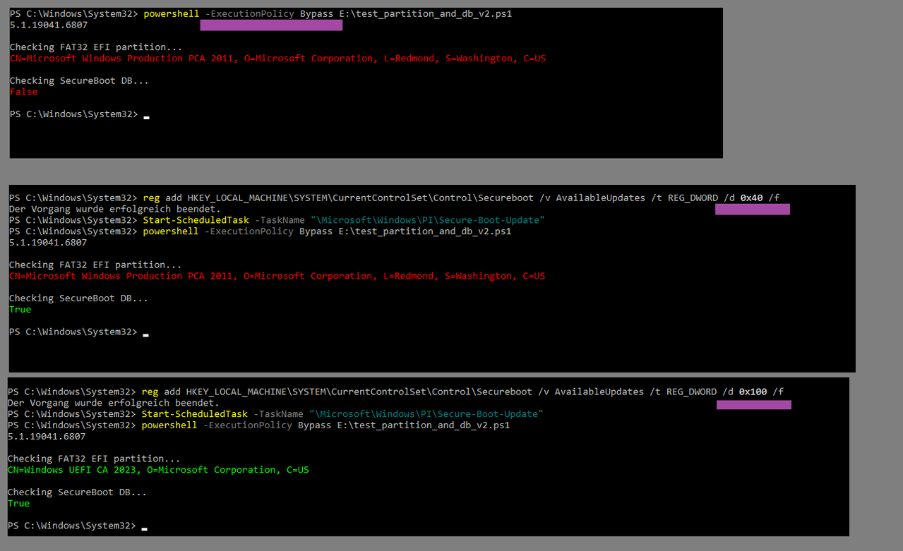 Nein. Das sagt nur aus, dass die von Dir abgefragten Zertifikate im UEFI installiert wurden. Und du fragst auch nur zwei der vier Zertifikate ab. Keine Info, ob das CA2011 zurückgezogen wurde, ob die DBX aktuell ist und ob der neue Bootmanager verwendet wird. Du fragst nur die Version vom alten Bootmanager mit CA2011 Zertifikat im Windows Onder, Der neue Bootmanager ist im „EFI_EX“Verzeichnis. Aber das alles sagt nichts aus, ob die „EX“ Dateien auch in der Systempartition stehen.