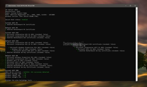 Über die Check UEFI PK, KEK, DB and DBX.cmd kann man dann die Abfrage per Rechtsklick als Administrator starten. Das könnte dann so aussehen.
