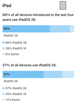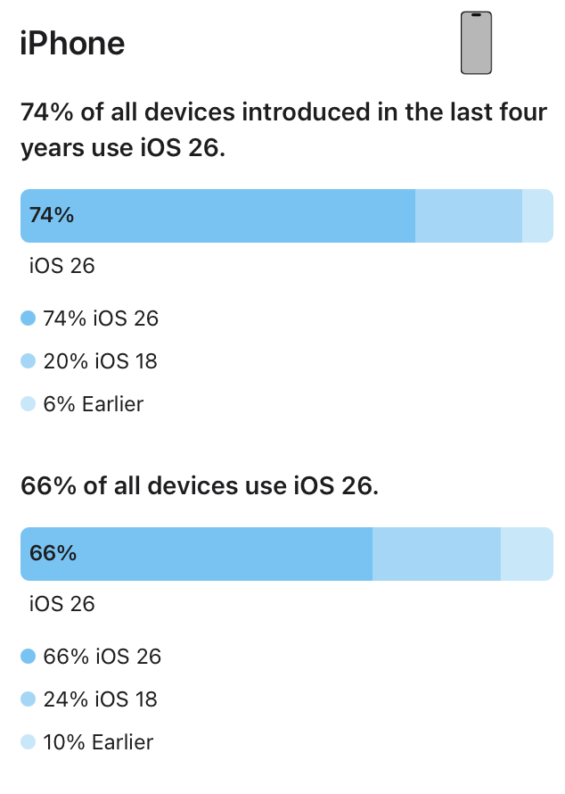 Nach Schätzungsversuchen durch diverse Statistikanbieter hat Apple zwischenzeitlich auf seiner Entwickler-Webseite offizielle Zahlen zur Update-Quote bekanntgegeben: Demnach laufen mittlerweile etwa 66 Prozent aller iPhones mit der aktuellsten iOS-Hauptversion. 24 Prozent der Nutzer setzen weiterhin auf iOS 18 und nur 10 Prozent nutzen eine ältere Version. Die Werte sind praktisch gleich mit der Update-Quote von iOS 18 vor einem Jahr.