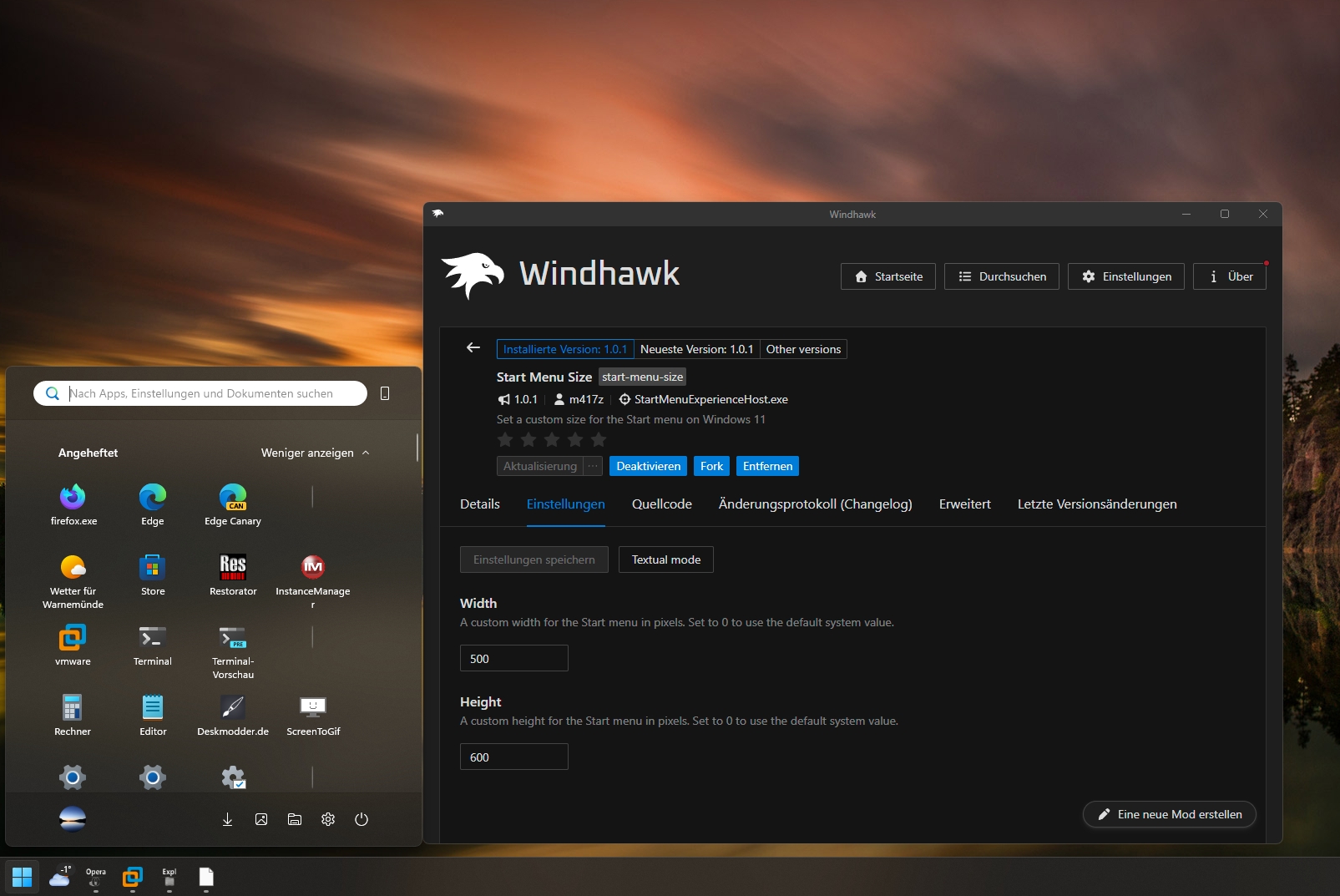 Windows 11 Größe vom Startmenü ändern mit dem Windhawk Mod Start Menu Size
