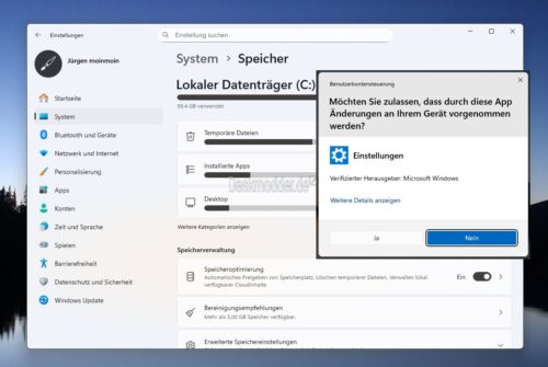 Da in den letzten Tagen immer mal wieder eine Frage in den Foren zum Aufruf der Einstellungen -> Speicher kam, dass die Benutzerkontensteuerung (UAC) aufploppt. Das ist kein Bug, sondern eine weitere Sicherung, dass nur berechtigte Nutzer den Bereich Speicher in den Einstellungen aufrufen können.