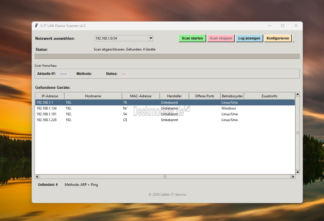 Die Anwendung ist sehr einfach. Startet man die S-IT-LANScanner.exe kann der Scan über den Button auch losgehen. Aufgelistet werden dann die Geräte, die sich im Netzwerk befinden. Natürlich nur die Geräte, die auch in Betrieb sind. In meinem Screenshot sind es der Windows 11 Rechner, der Fernseher und zwei Handys. Sie werden zwar nicht direkt benannt, aber man kann sie trotzdem einordnen.