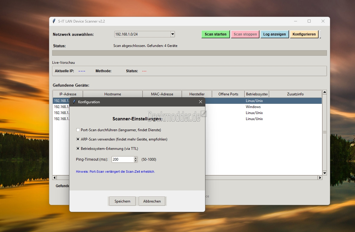 Da das Tool portabel ist, kann es auf einen Stick und man kann es dann beispielsweise bei einem „Notfall“ auch anwenden. Hat man verschiedene Netzwerke, so lassen die sich in der Menüleiste auch auswählen. Unter „Konfiguration“ sind auch noch weitere Einstellungen möglich.