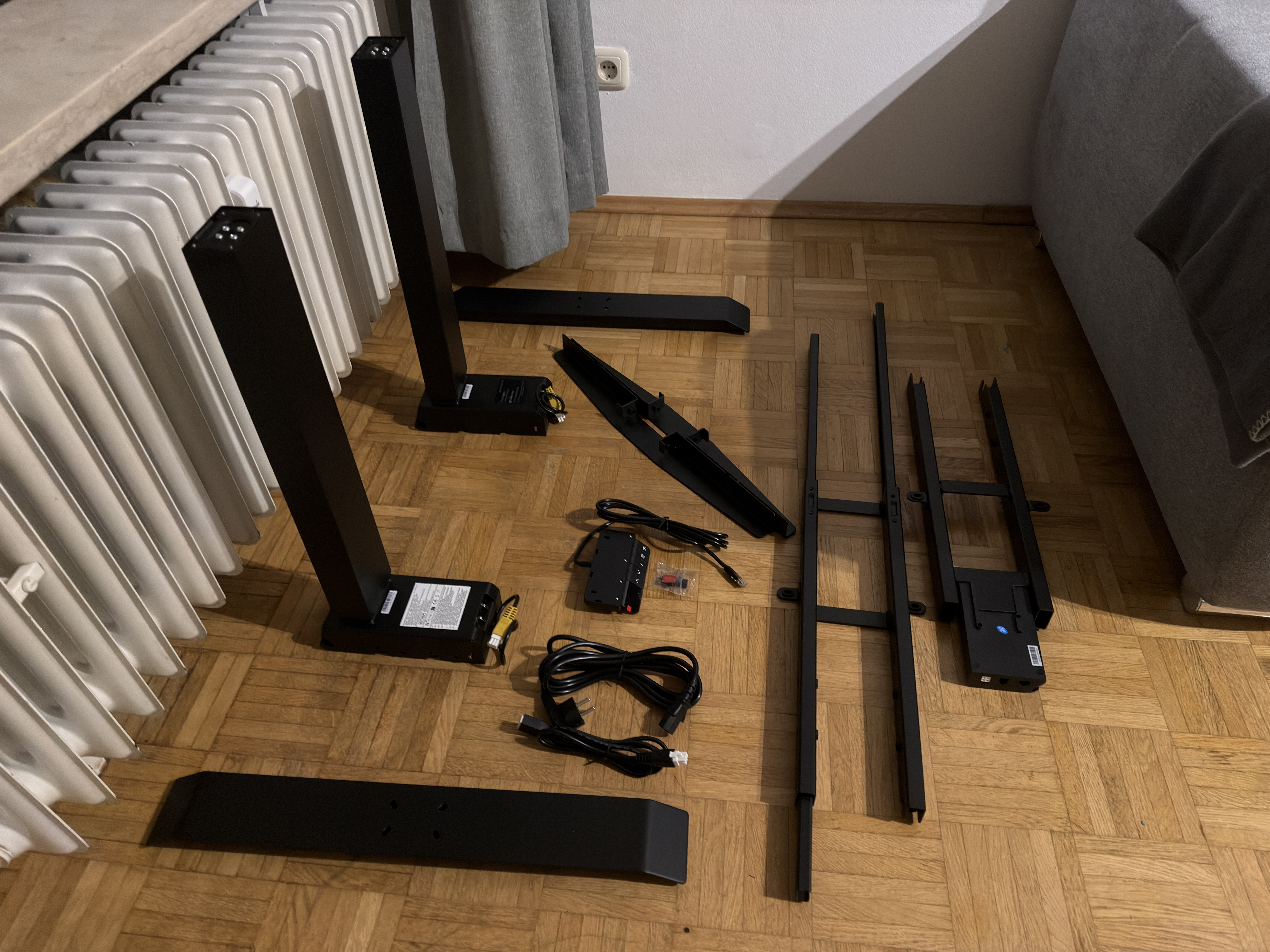 Der Maidesite T2 Pro Max wird in zwei separaten Kartons geliefert. Im ersten Karton befindet sich die Tischplatte, im zweiten das komplette Tischgestell inklusive Elektronik, Schrauben und Zubehör. Die Kartons sind gut gepolstert, sodass während des Transports nichts beschädigt wird. Das Tischgestell fühlt sich massiv und hochwertig an, die Oberflächen sind sauber lackiert und es gibt keine scharfen Kanten oder unsauberen Stellen. Die Tischplatte in Vintagebraun sieht in echt sogar noch besser aus als auf den Fotos. Auch die Schrauben und Kleinteile sind sortiert in beschrifteten Tüten verpackt. Hier hat Maidesite im Vergleich zu den Vorgängermodellen viel mehr richtig gemacht.