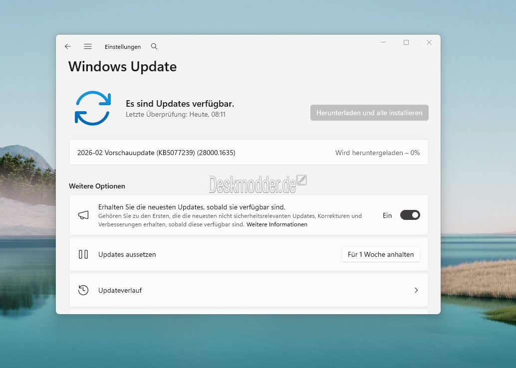 (Update 20.02.2026): Microsoft hat die KB 5077239 noch einmal überarbeitet. Dadurch erhöht sich die Versionsnummer auf die Windows 11 26H1 28000.1641. Das Update selber wird derzeit weiterhin im RP-Kanal über Windows Update verteilt. Den Download des Updates unten haben wir aktualisiert