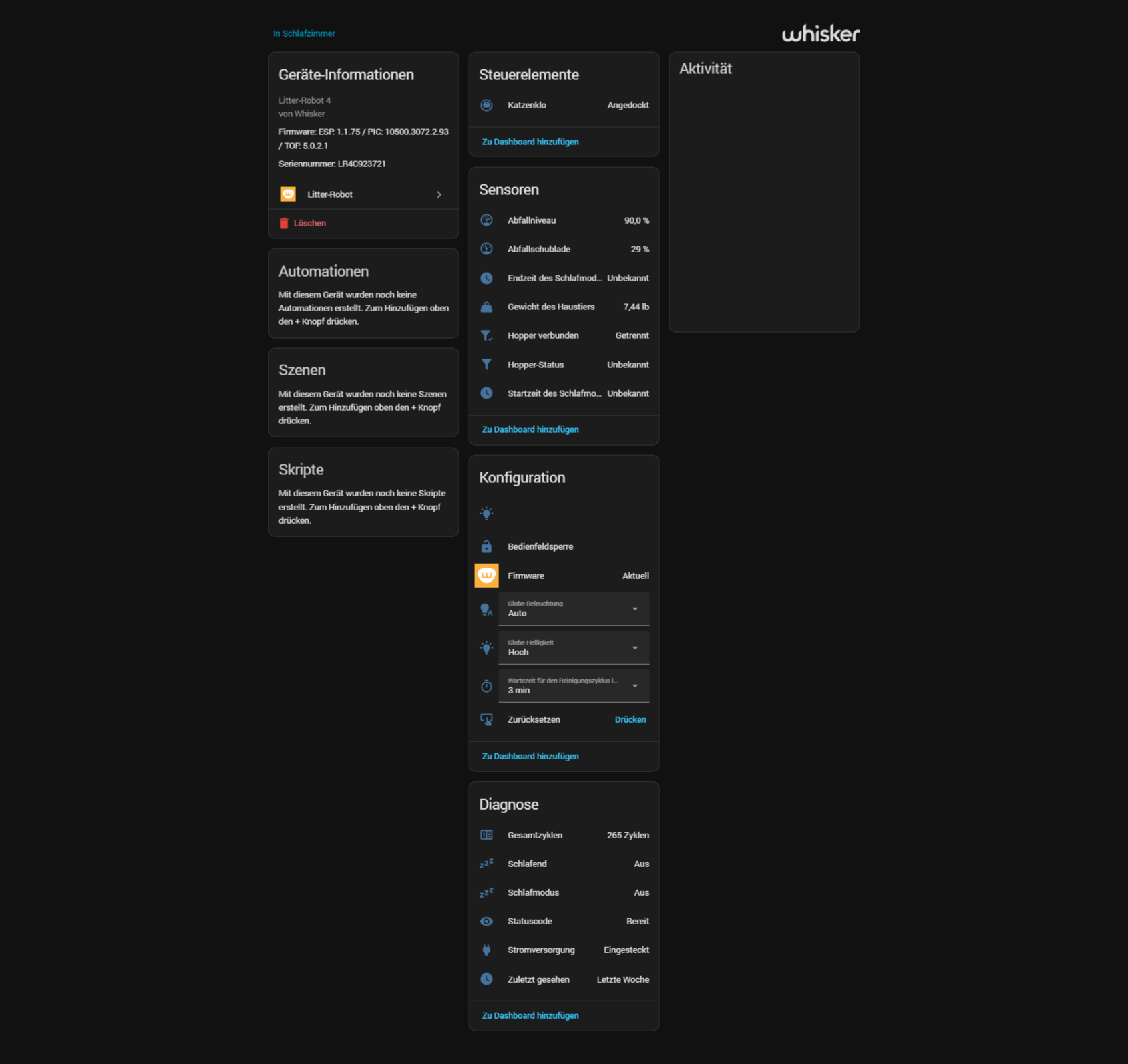 Wer Home Assistant einsetzt, kann den Litter-Robot 4 sauber integrieren. Füllstand, Gewicht, Statusmeldungen und Zyklusdaten lassen sich einbinden. Daraus entstehen Automationen, etwa Benachrichtigungen bei vollem Behälter oder Hinweise bei ungewöhnlich geringer Nutzung.
