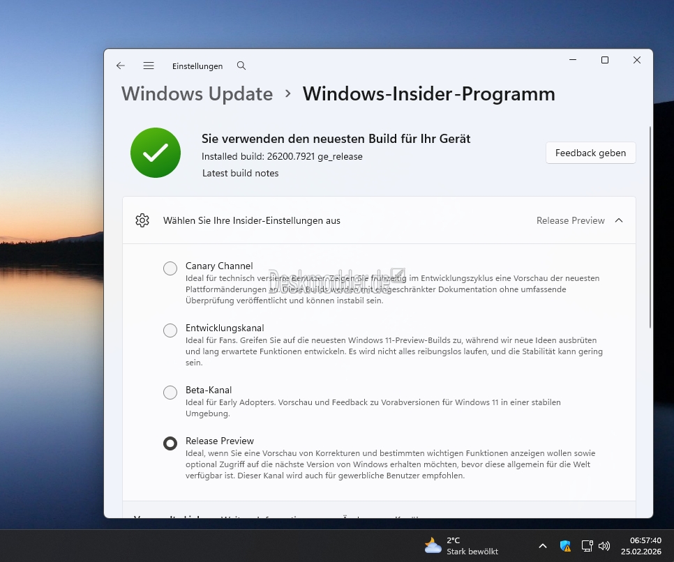 Mal ein kurzer Hinweis für diejenigen unter euch, die mit der Windows 11 25H2 Release Preview (26200) unterwegs sind. gur_helios hat mich eben informiert, dass seine 26200.7921 automatisch die 26220.7872 herunterlädt. Ein Blick in die Insider-Einstellung zeigt, dass dort Beta eingetragen ist.
