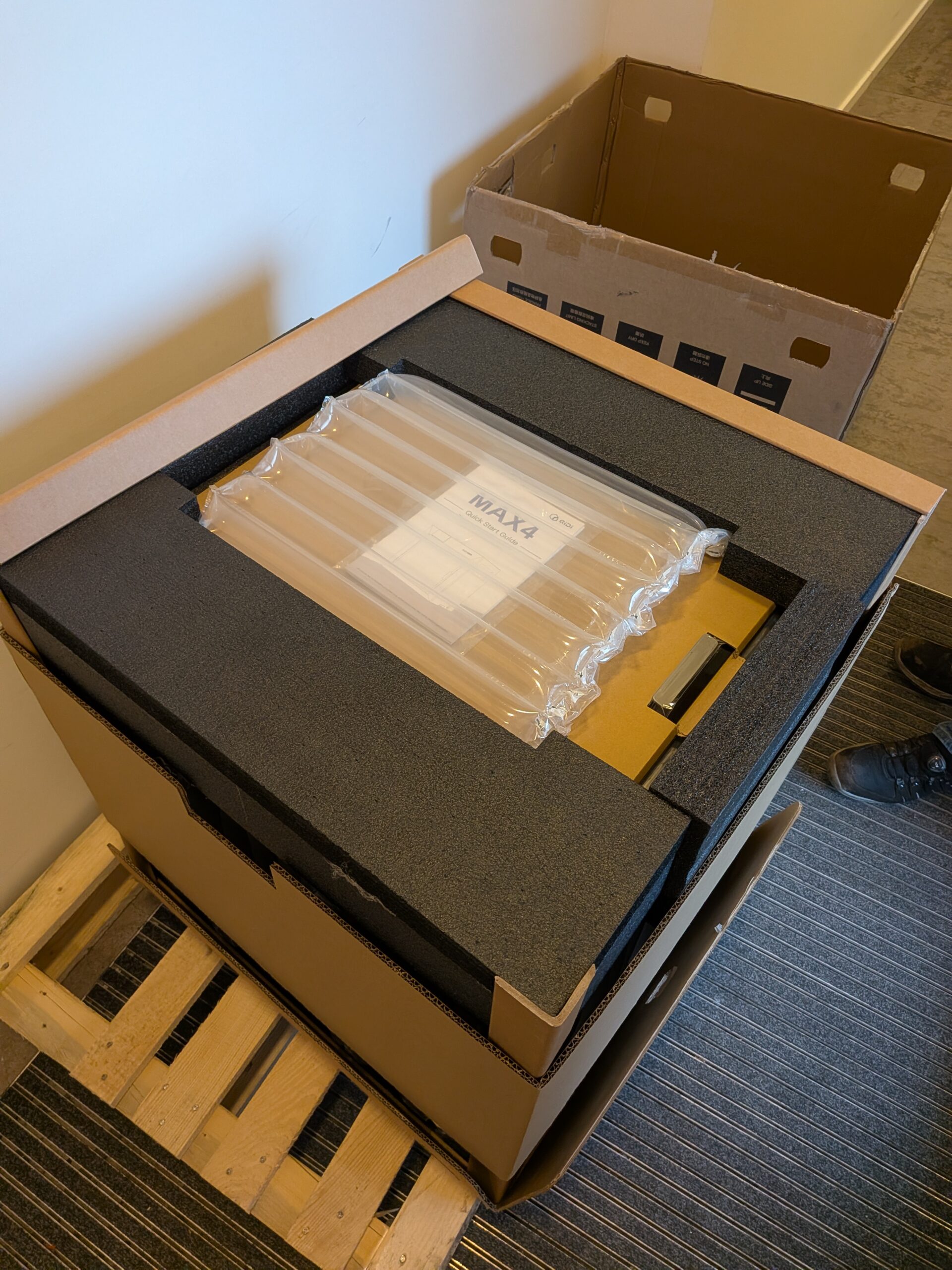 Angesichts des massiven Rahmens und des großen Bauvolumens fällt die Verpackung des Max4 entsprechend groß dimensioniert und robust aus. QIDI legt sichtlich Wert darauf, dass die empfindliche Mechanik – insbesondere die Spindeln und die Linearführungen – durch passgenaue Schaumstoff-Inlays gesichert sind. Der Drucker wird weitestgehend vormontiert geliefert, was den Aufbau auf wenige Handgriffe reduziert.
