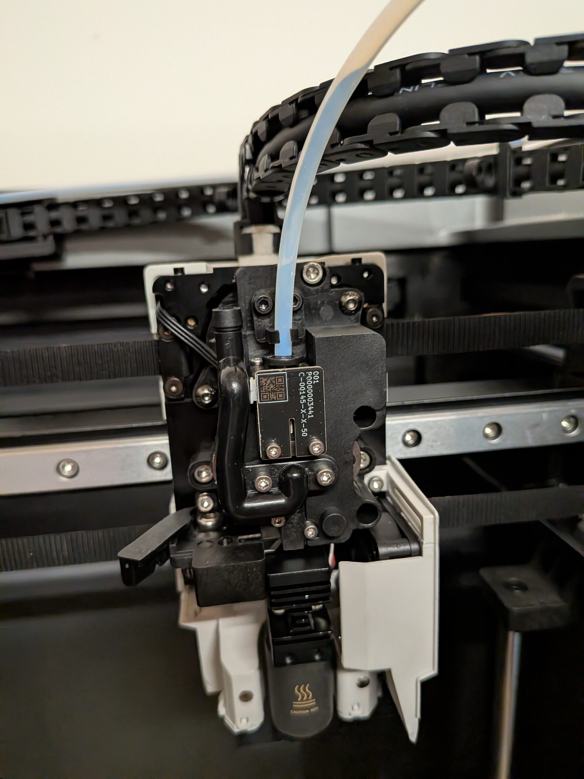 Ein High-Speed-Drucker benötigt ein Hotend, das das Filament schnell genug schmelzen kann. Das Extrusionssystem des Max4 erreicht eine Flussrate von 40 mm³/s und eine maximale Temperatur von 370 °C. Die eingesetzte Bimetall-Edelstahldüse ist gehärtet, was sie widerstandsfähig gegen abrasive Filamente wie Carbon (CF) oder Glasfaser macht. Eine Keramik-Einführhülse und ein neu gestaltetes Wärmeableitmodul sollen das Risiko von Verstopfungen im „Cold End“ minimieren.