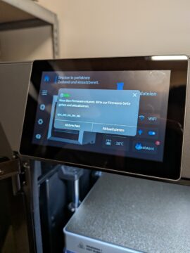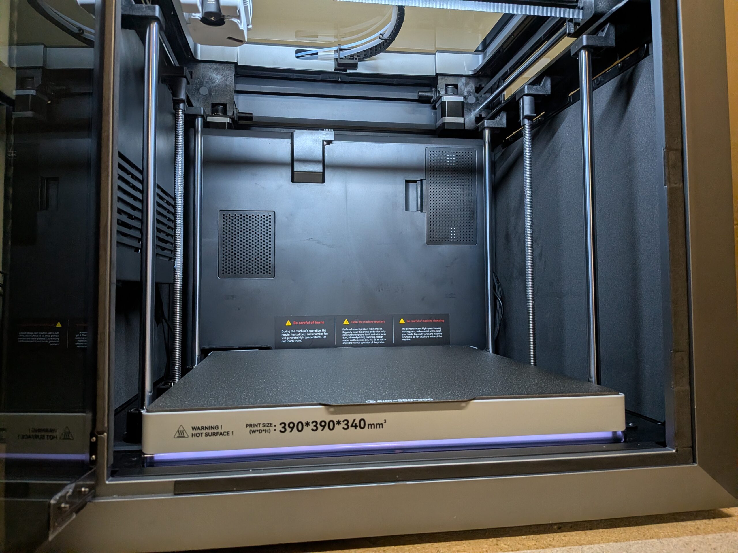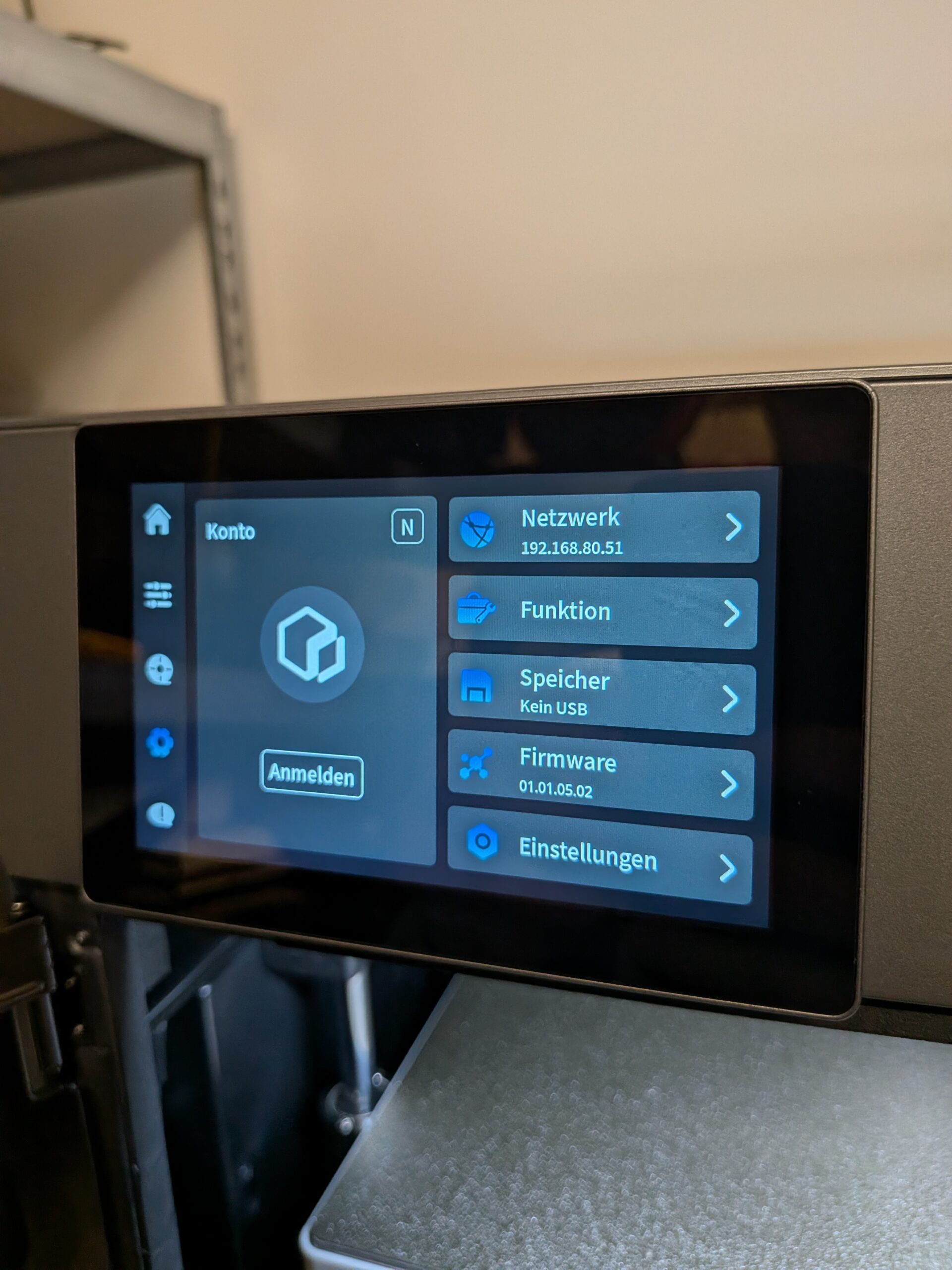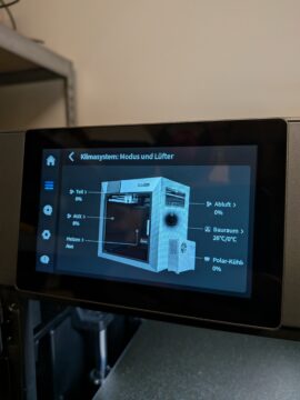 Was beim ersten Einschalten sofort ins Auge sticht, ist das Beleuchtungskonzept. Besonders die Beleuchtung unter dem Druckbett sorgt für einen echten Hingucker. Es wirkt fast schon ein wenig „spacig“ und futuristisch, ist dabei aber keineswegs kitschig, sondern sehr schick umgesetzt. Es verleiht dem Drucker eine moderne Ästhetik, die gut zu seiner technischen Ausrichtung passt.