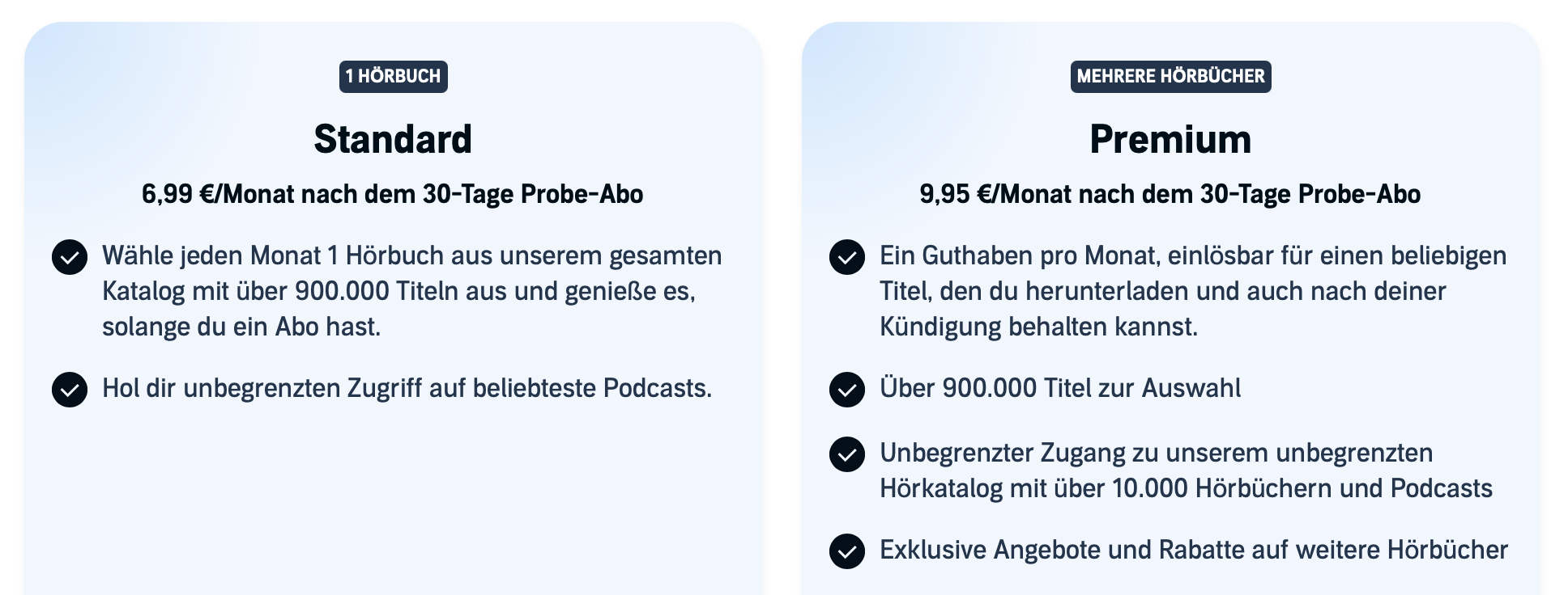 Audible informiert aktuell darüber, dass man in einigen Ländern – darunter auch Deutschland – ein neues Standard-Abo für 6,99 Euro im Monat anbietet. Im Gegensatz zum weiter bestehenden normalen Premium-Abo für 9,99 Euro hat man allerdings nur für die Dauer des Abos Zugriff auf den Audible-Katalog. Man kann also keine Titel „behalten“, um sie später nach Ablauf des Abos nochmal anzuhören. Audible Standard ist demnach vergleichbar mit klassischen Streaming-Anbietern.