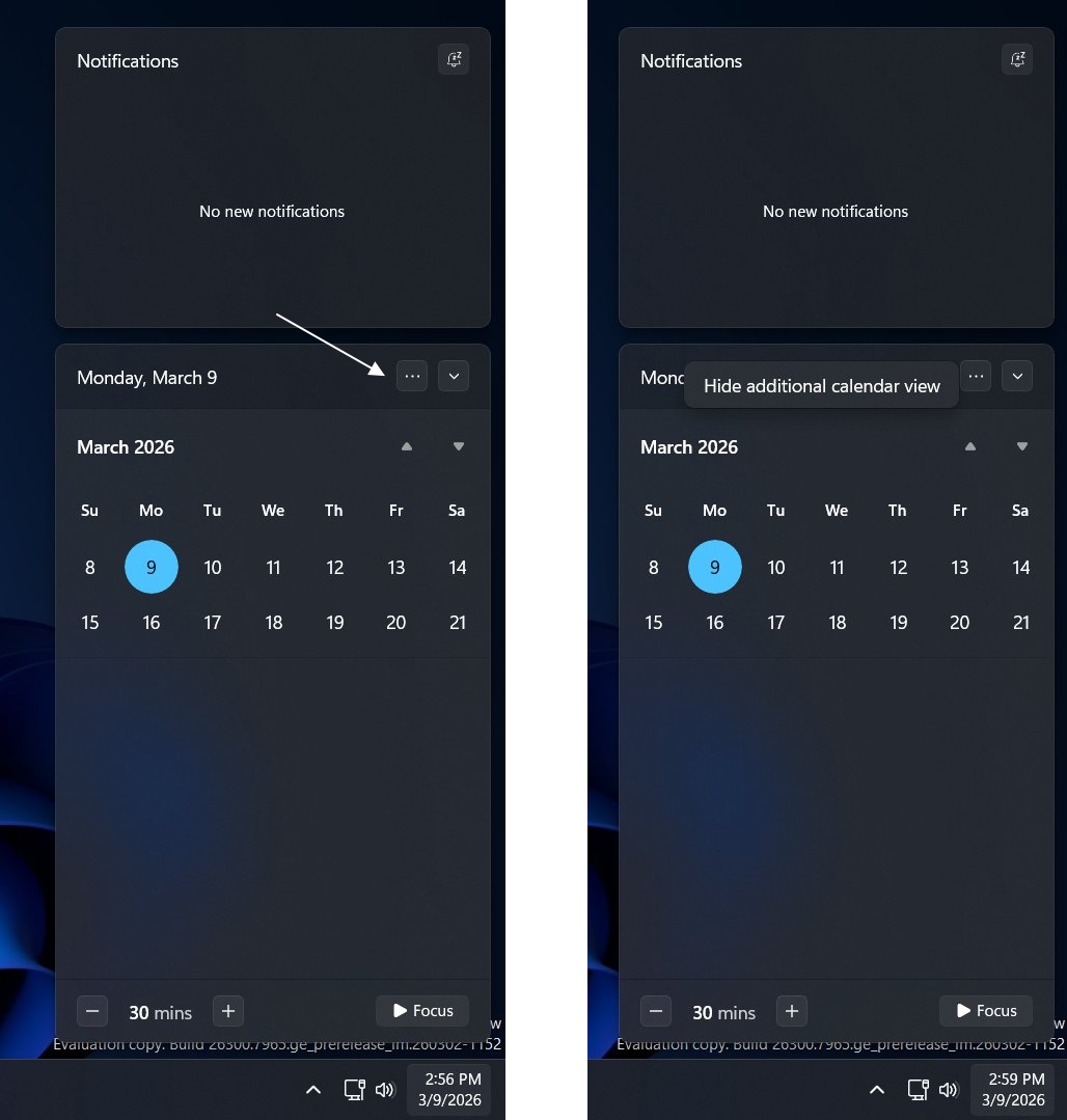 Im November 2025 kündigte Microsoft an, dass man im Benachrichtigungsbereich (Info-Center) zum Kalender, der derzeit keine Funktion hat, die Kalendereinträge wieder integrieren will. Das sollte im Dezember 2025 passieren, kam aber nicht. Jetzt soll es aber wirklich kommen.