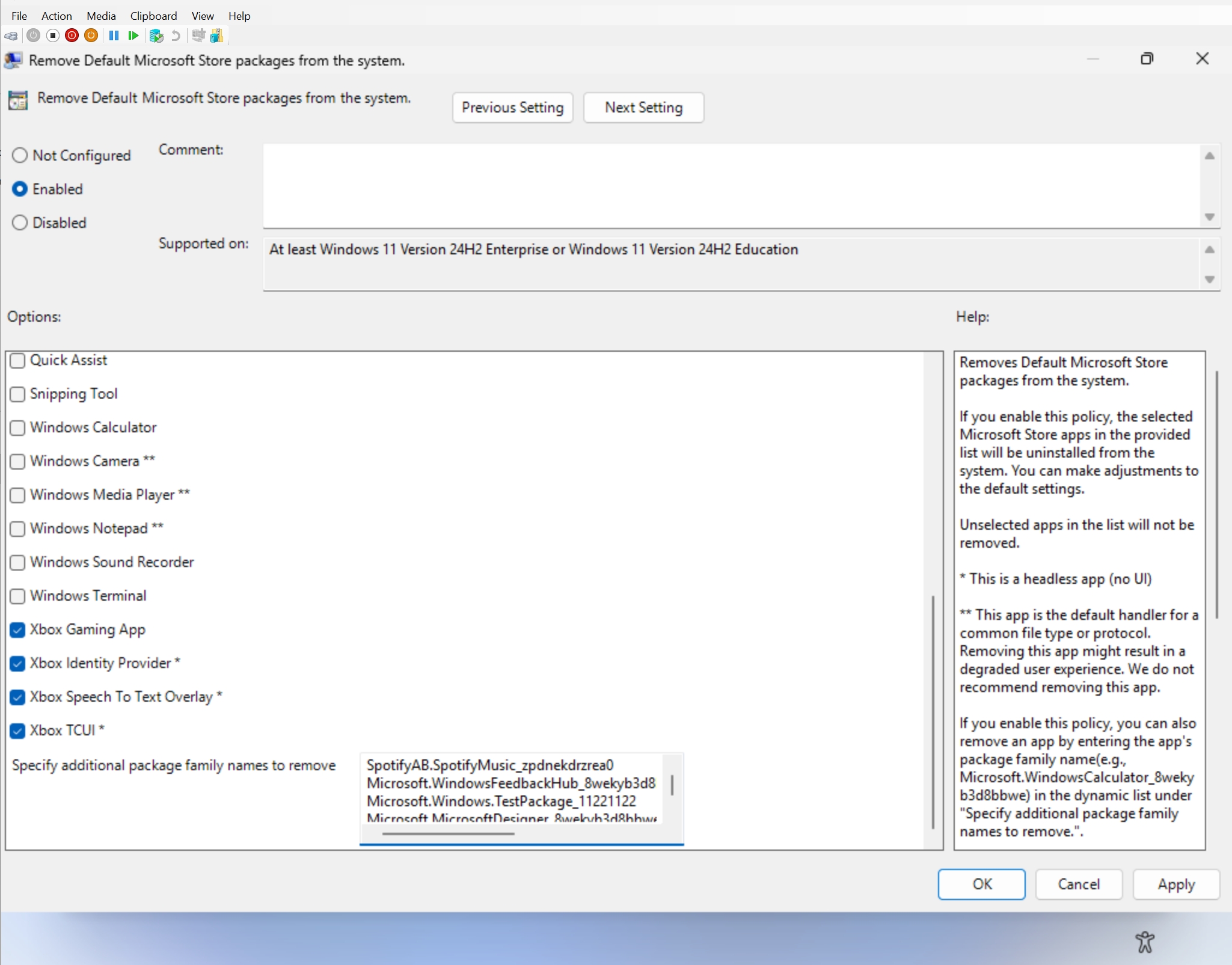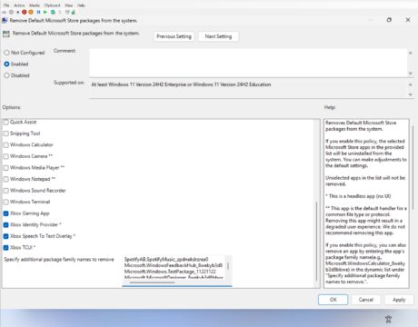 Richtlinienbasiertes Entfernen vorinstallierter Microsoft-Apps – Wir haben die Richtlinie „Standard-Microsoft-Store-Pakete entfernen“ für Windows ENT/EDU aktualisiert und um eine dynamische Liste zum Entfernen von Apps erweitert. IT-Administratoren können nun MSIX-/APPX-Apps entfernen, indem sie deren App-Paketfamiliennamen (PFNs) zu einer dynamischen Liste hinzufügen. zu finden unter Computerkonfiguration > Administrative Vorlagen > Windows-Komponenten > Bereitstellung von App-Paketen > Standard-Microsoft-Store-Pakete vom System entfernen