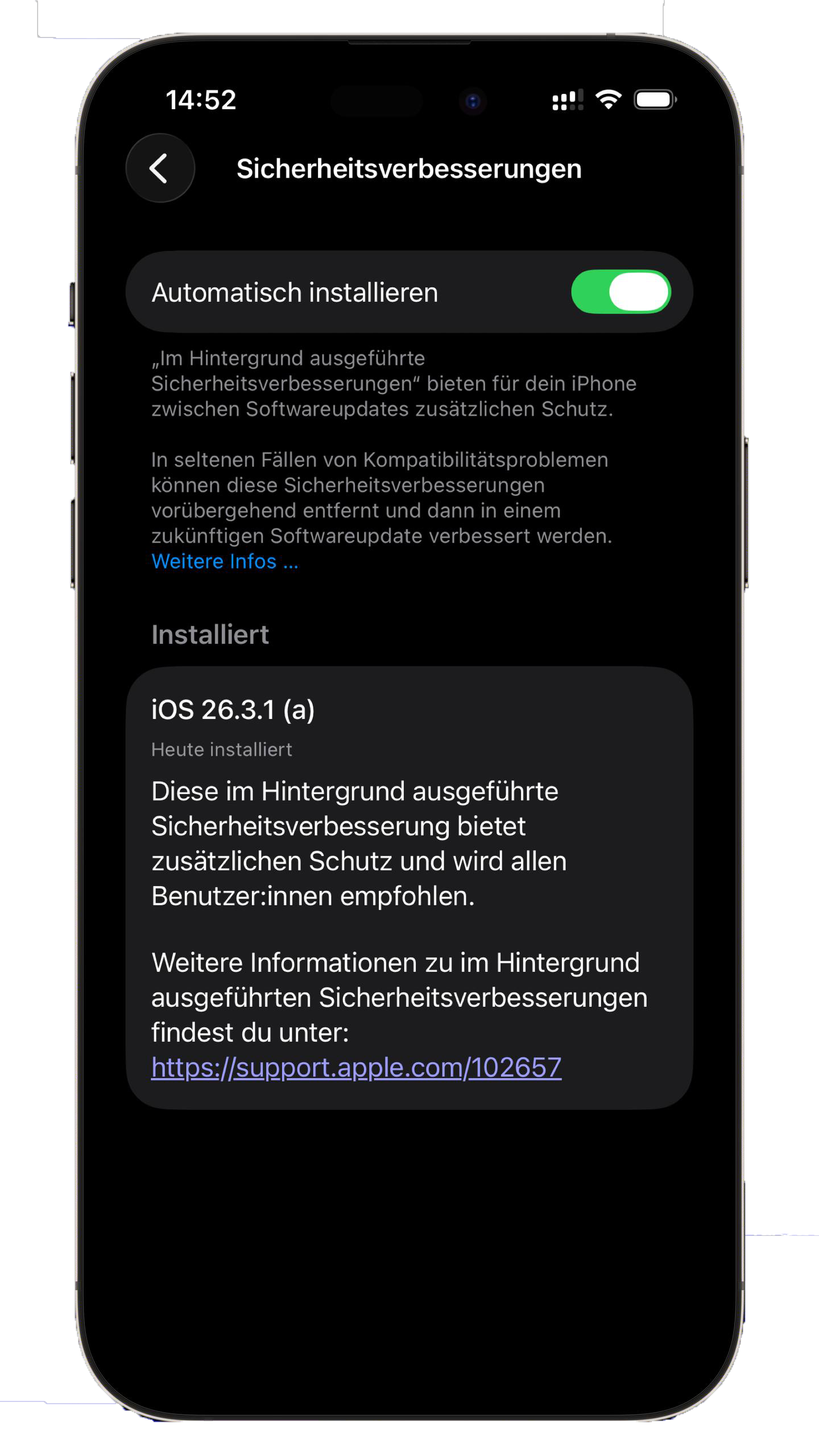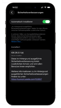 Die „im Hintergrund ausgeführten Sicherheitsverbesserungen“ kommen damit erstmals sichtbar im Alltag zum Einsatz. Zwar hatte Apple die Funktion bereits früher eingeführt, im regulären Betrieb spielte sie bislang aber kaum eine Rolle. Mit iOS 26.3.1 (a) zeigt sich nun, wie Apple künftig auf akute Sicherheitsprobleme reagieren will: schneller, gezielter – aber auch weniger transparent für den Nutzer.