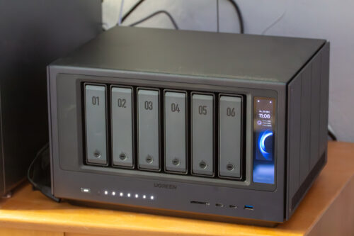 Im Inneren arbeitet ein Intel Core Ultra 7 255H, kombiniert mit 64 GB LPDDR5x. Der Arbeitsspeicher ist allerdings fest verlötet, eine spätere Aufrüstung ist also nicht vorgesehen. Für die eigentliche Datenspeicherung stehen sechs SATA-Schächte bereit, dazu kommen zwei M.2-Slots für NVMe-SSDs, die sich unter anderem als schneller Cache nutzen lassen. Beim Netzwerk fährt Ugreen schweres Geschütz auf. Zwei 10-Gbit-Ethernet-Ports sind an Bord, sodass sich das System parallel in ein bestehendes Netzwerk einbinden und gleichzeitig direkt mit einer Workstation verbinden lässt. Gerade in gemischten Setups ist das praktisch, weil sich so unterschiedliche Nutzungsszenarien ohne Umwege abbilden lassen.