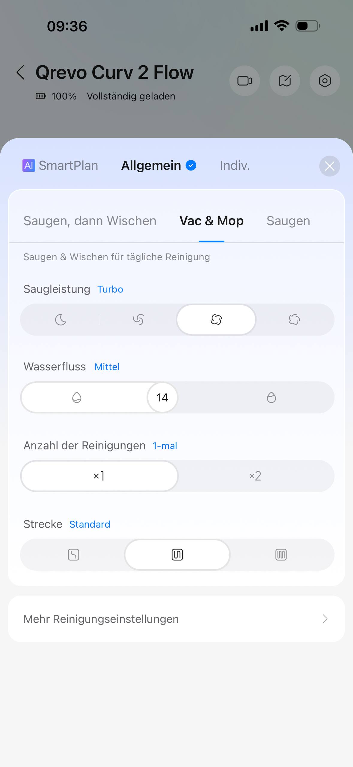 Die Reinigungsdauer hängt stark vom Modus ab. In meiner 73 qm Wohnung braucht der Roboter ungefähr zwei Stunden, je nachdem, wie intensiv gesaugt und gewischt wird. Das ist nicht ungewöhnlich, sollte aber eingeplant werden. Vor allem dann, wenn man Reinigungsläufe tagsüber in den Alltag integrieren möchte. Praktisch ist dabei, dass der Roboter so autonom arbeitet, dass die reine Laufzeit im Alltag weniger stört als bei klassischen Staubsaugern. Man startet ihn, lässt ihn arbeiten und kümmert sich später um den Rest.