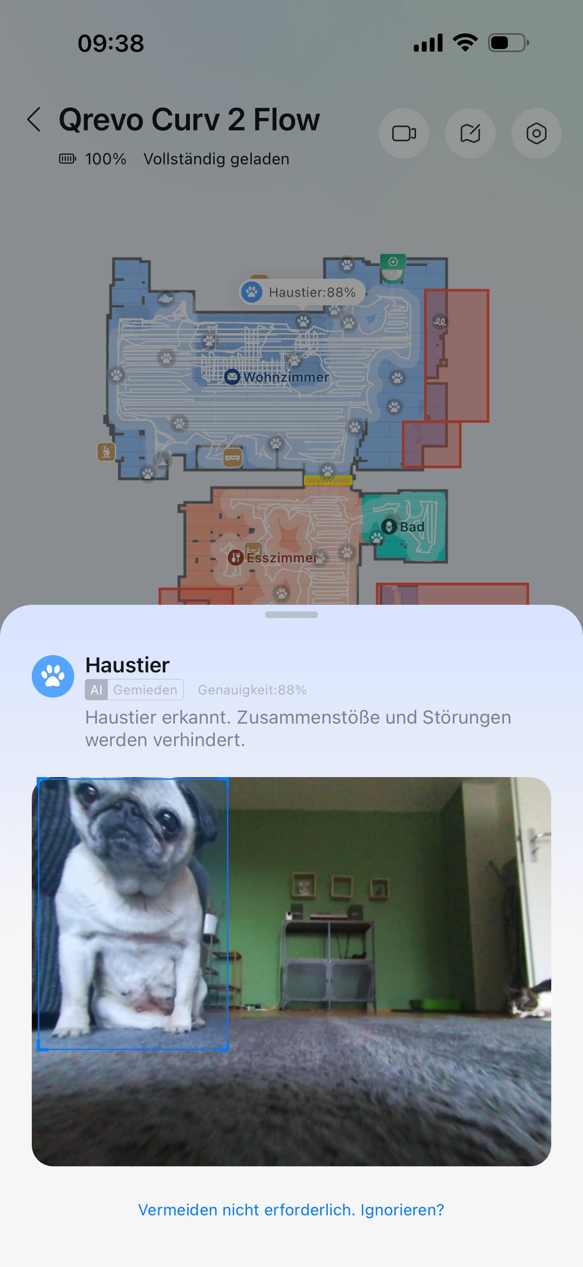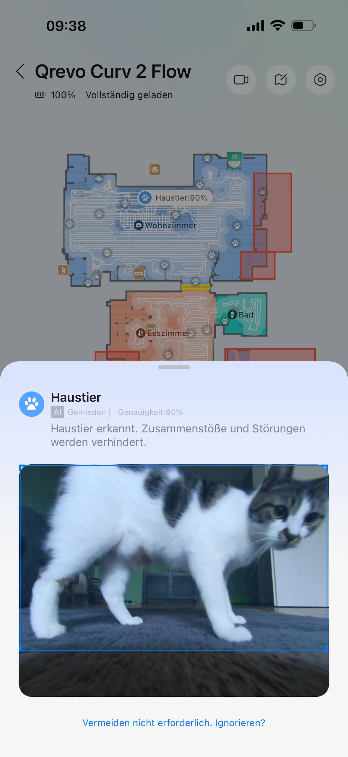 Im Alltag navigiert der Qrevo Curv 2 Flow ordentlich durch die Wohnung. Die Kartierung funktioniert schnell und die Fahrwege wirken nachvollziehbar. Offiziell setzt Roborock auf PreciSense LiDAR und eine Reactive AI-Hinderniserkennung, die laut Hersteller mehr als 200 Objektarten erkennt und umfahren kann. Dazu kommen strukturierte Beleuchtung und RGB-Kamera. Besonders spannend ist das Thema Haustiere. Genau hier passt der Qrevo Curv 2 Flow gut in meinen Alltag. Die Fotos und Screenshots zeigen, dass der Roboter Tiere tatsächlich erkennt und entsprechend reagiert. Roborock bewirbt dazu automatische Haustier-Erkennung, Fotoaufnahmen, Tierortung und sogar Video-Funktionen. Im Test war vor allem die Erkennung im Wohnungsalltag interessant, weil der Roboter dadurch weniger hektisch auf Katzen und Hund zugesteuert ist.