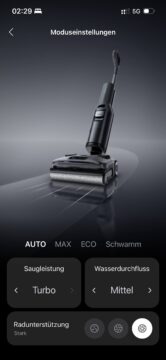 Die automatische Reinigung der Wischwalze gehört zu den großen Stärken des Systems. Durch den Einsatz von heißem Wasser wird nicht nur Schmutz effektiv entfernt, sondern auch die Hygiene verbessert. Ergänzt wird dies durch eine integrierte Trocknung, die Geruchsbildung vorbeugt und den Wartungsaufwand reduziert. Allerdings zeigt sich hier auch eine Schwäche. Die als „leise“ deklarierte Trocknung ist im Alltag deutlich wahrnehmbar und entspricht nicht unbedingt der Erwartung, die dieser Modus suggeriert. Zwar lässt sich der Vorgang zeitlich planen, dennoch bleibt die Geräuschkulisse ein Punkt, den man im Alltag berücksichtigen sollte.