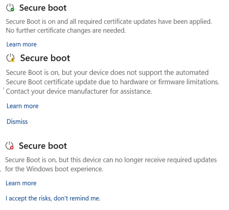 - Warum wird ein gelbes Ausrufezeichen angezeigt? Ein gelbes Symbol bei „Secure Boot“ bedeutet, dass bei Ihrem Gerät ein behebbares Problem vorliegt, beispielsweise eine Hardware- oder Firmware-Einschränkung, die die automatische Zertifikatsaktualisierung verhindert. Wenden Sie sich an den Hersteller Ihres Geräts, um Unterstützung zu erhalten.