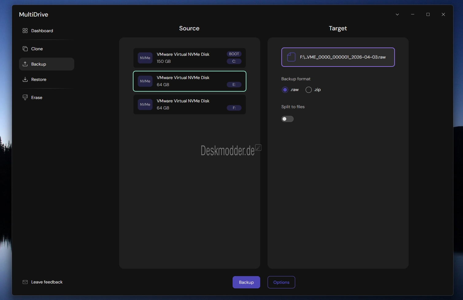 Mit MultiDrive kann man ein Backup einer Festplatte erstellen lassen. Hier hat man die Auswahl, ob man das Backup als RAW oder ZIP anlegen möchte. Der Clou ist, dass man auch mehrere Operationen parallel abarbeiten lassen kann. Dies wird dann im Dashboard angezeigt. Selbst wenn Lesefehler auf der Ausgangsfestplatte bestehen, kann diese geklont werden.