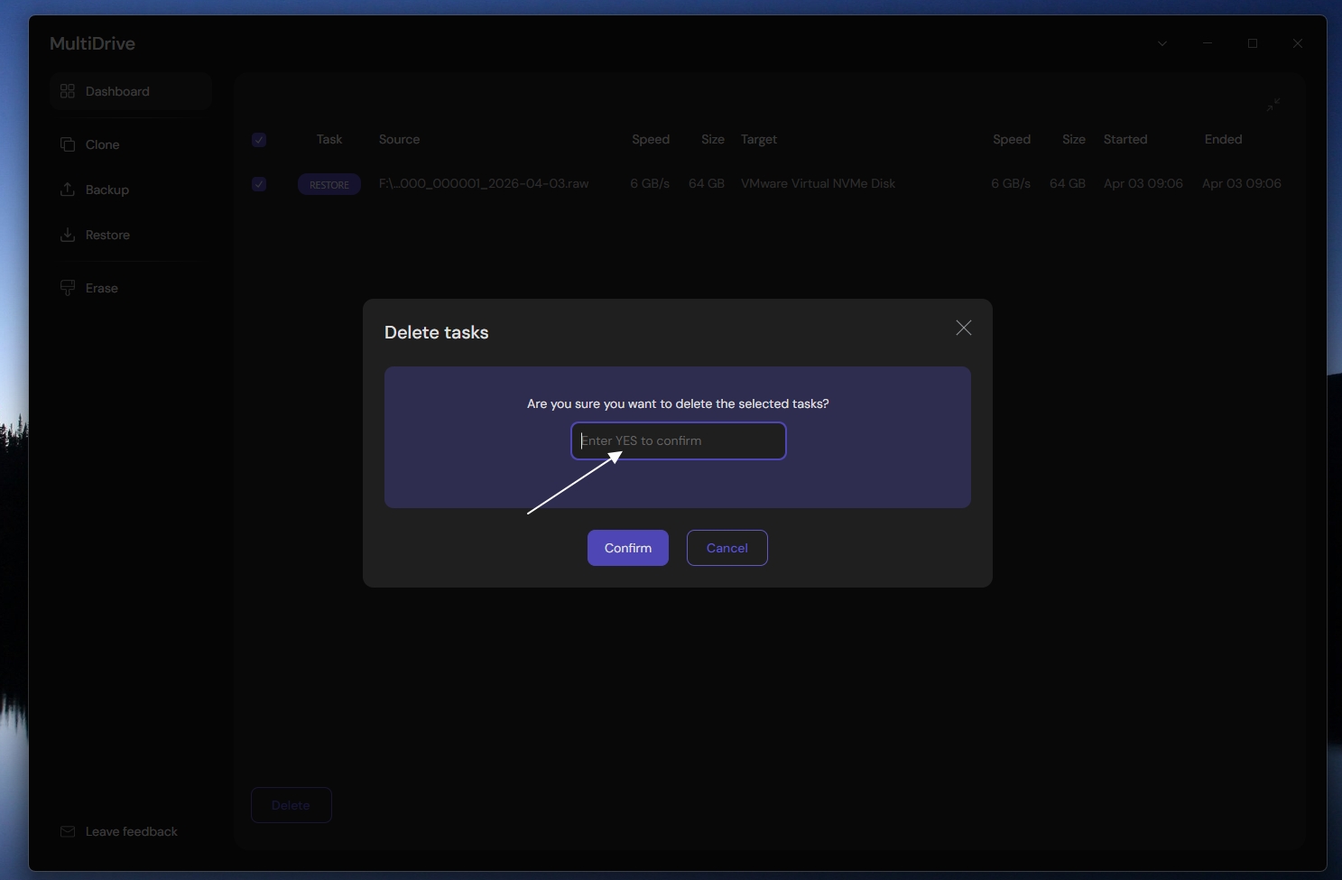 Neben dem Backup ist auch das Klonen und das komplette Löschen einer Festplatte / SSD möglich. Jede wichtige Funktion muss mit YES im Feld bestätigt werden. Somit kann man beispielsweise nicht einmal eine Festplatte komplett löschen.
