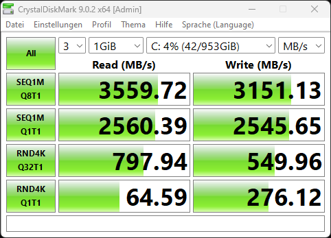 Mit rund 3600 MB/s lesend und 3100 MB/s schreibend liegt sie klar über dem, was man von SATA kennt. Gleichzeitig bleibt sie aber unterhalb aktueller PCIe-4.0-Laufwerke. Im Alltag macht sich das kaum bemerkbar, da das System insgesamt sehr reaktionsschnell bleibt.