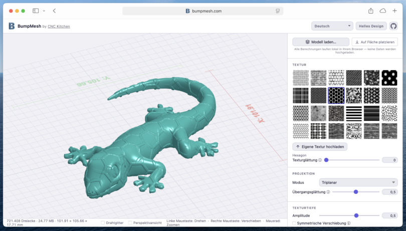 Bumbmesh.com läuft nach dem Aufruf komplett offline im Browser und kann STL-, OBJ- und 3MF-Dateien mit unzähligen Einstellungsmöglichkeiten bearbeiten. Die Struktur wird durch ein Schwarz-Weiß-Bild vorgegeben und kann auch auf bestimmte Bereiche begrenzt werden. Muss man einfach mal ein bisschen herumspielen – mal sind die Ergebnisse besser, mal schlechter. Auf Github gibt es noch ein paar mehr Infos.