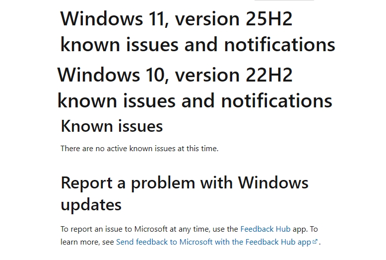 Schaut man heute in diese Listen der einzelnen Versionen, dann erscheint entweder alles behoben, oder „Derzeit gibt es keine aktiven Probleme“. Wobei ganz stimmt es nicht, auch wenn hier in den einzelnen Kategorien zu den Windows Versionen nichts aufgelistet ist. Denn einige Fehlermeldungen wurden separat unter support.microsoft veröffentlicht. Aber alles in allem muss man doch schon erwähnen, dass Microsoft in der Zwischenzeit nicht mehr auf Hauruck alles raushaut, sondern eben auch die Fehler korrigiert hat, die sich mit der Zeit angesammelt haben.