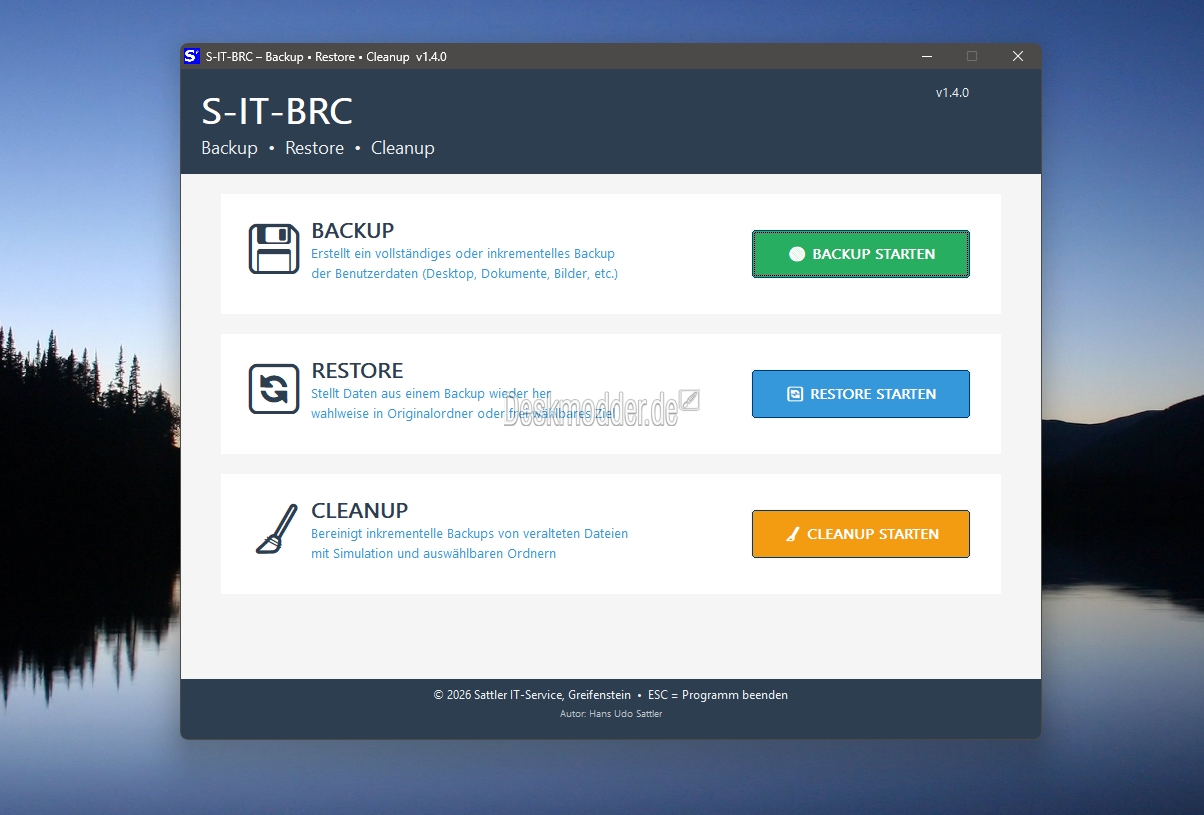 Dieses Tool sollte sehr einfach in der Bedienung werden. Ich sage mal, das ist es auch geworden. Das S-IT-BRC besteht aus drei Modulen. Backup von Dateien, Restore von Dateien und auch ein Cleanup-Tool. Damit können aus den inkrementelle Backups veraltete Dateien gelöscht, oder in einen Archiv-Ordner geschoben werden.