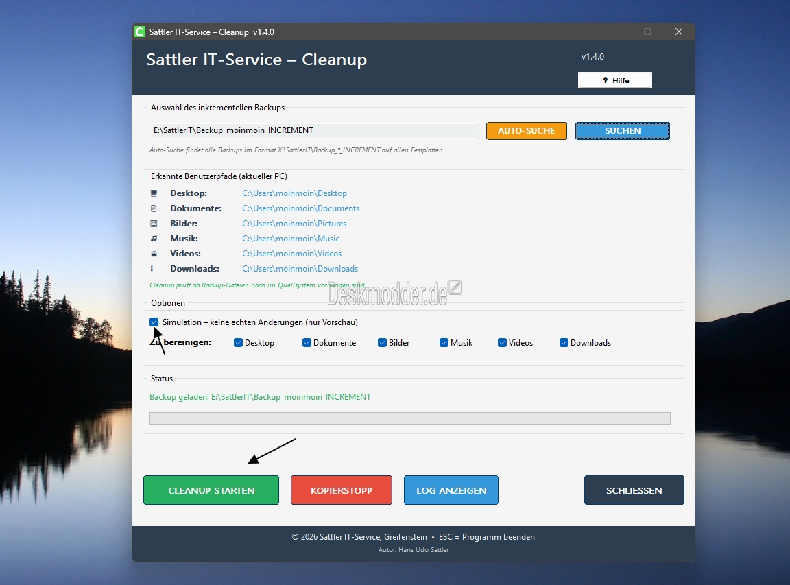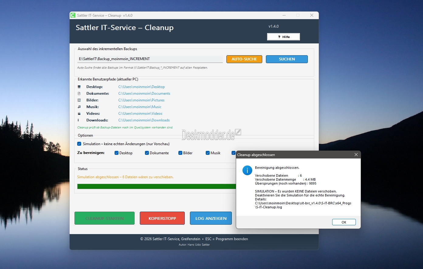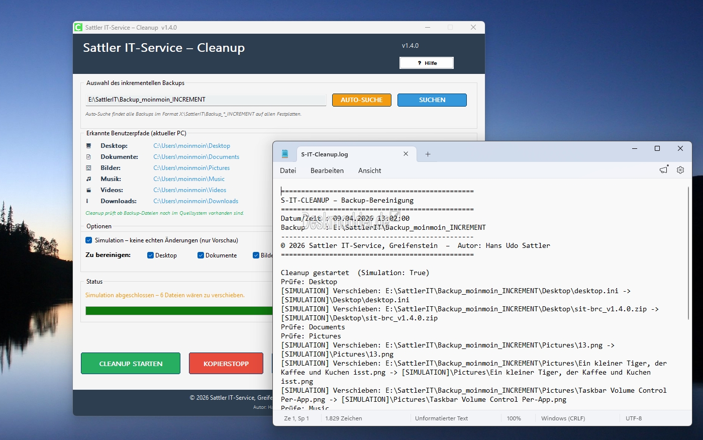 S-IT-BRC wird über die S-IT-BRC-Setup.exe entweder installiert, oder man wählt einen Ordner / Stick für die portable Nutzung aus. Dann kann man die S-IT-BRC.exe starten und das erste Backup erstellen. Hat man mit der Zeit schon mehrere Backups erstellt, kann man die Cleanup-Funktion nutzen. Entweder als Simulation, oder „richtig“. Ist eine Funktion abgearbeitet, wird dann in einem Popup das Ergebnis angezeigt. Eine Log-Datei steht auch zur Verfügung.