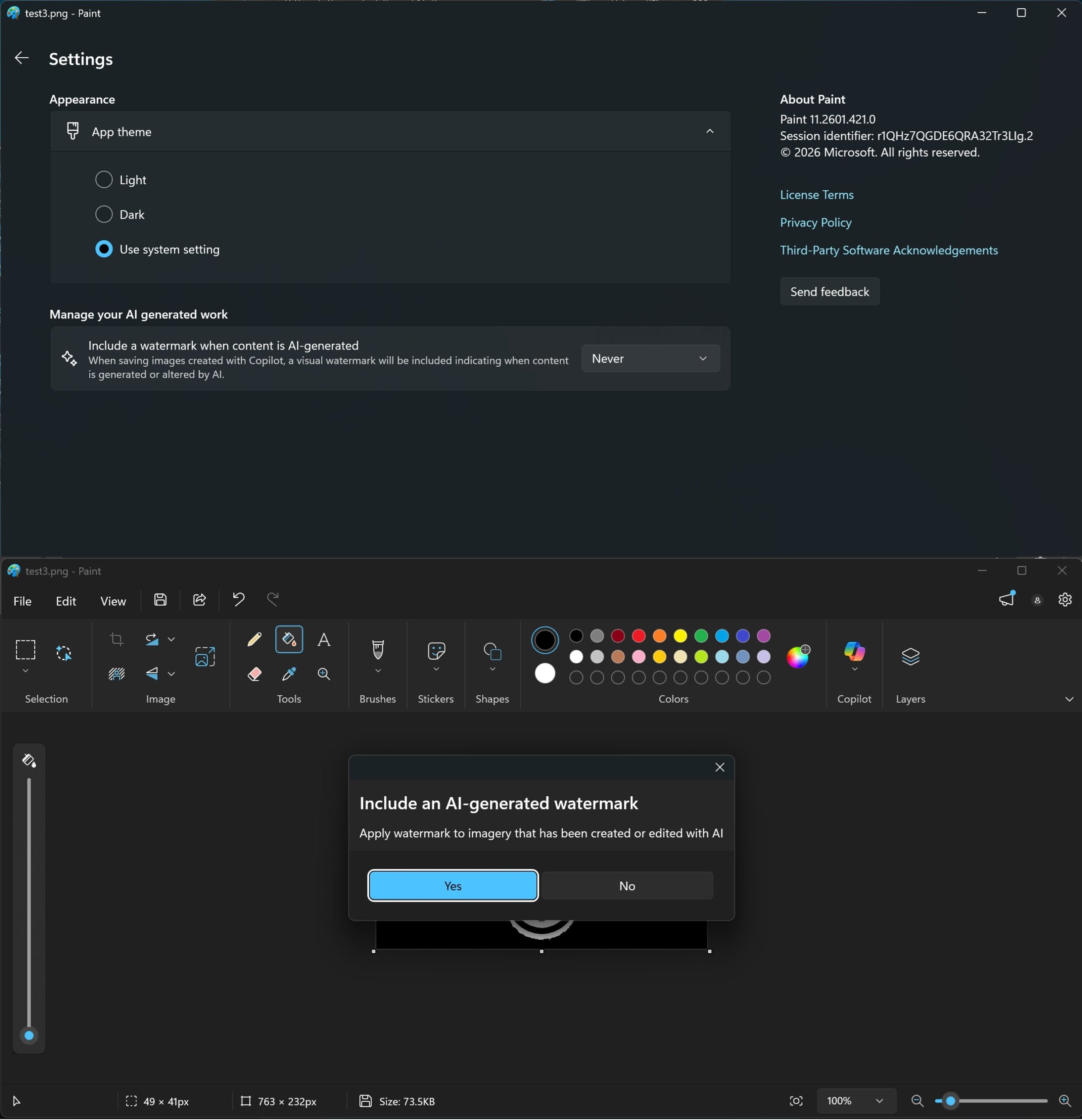 Dafür hat man in Paint eine neue Einstellung hinzugefügt. So kann man jetzt in KI-generierten Bildern ein Wasserzeichen hinzufügen. In den Einstellungen hat man die Möglichkeit, das Wasserzeichen immer hinzuzufügen oder auf Nachfrage. Hier hat man den Copiloten als solchen beibehalten. Aber wer weiß, vielleicht findet man dort auch eine andere Bezeichnung.