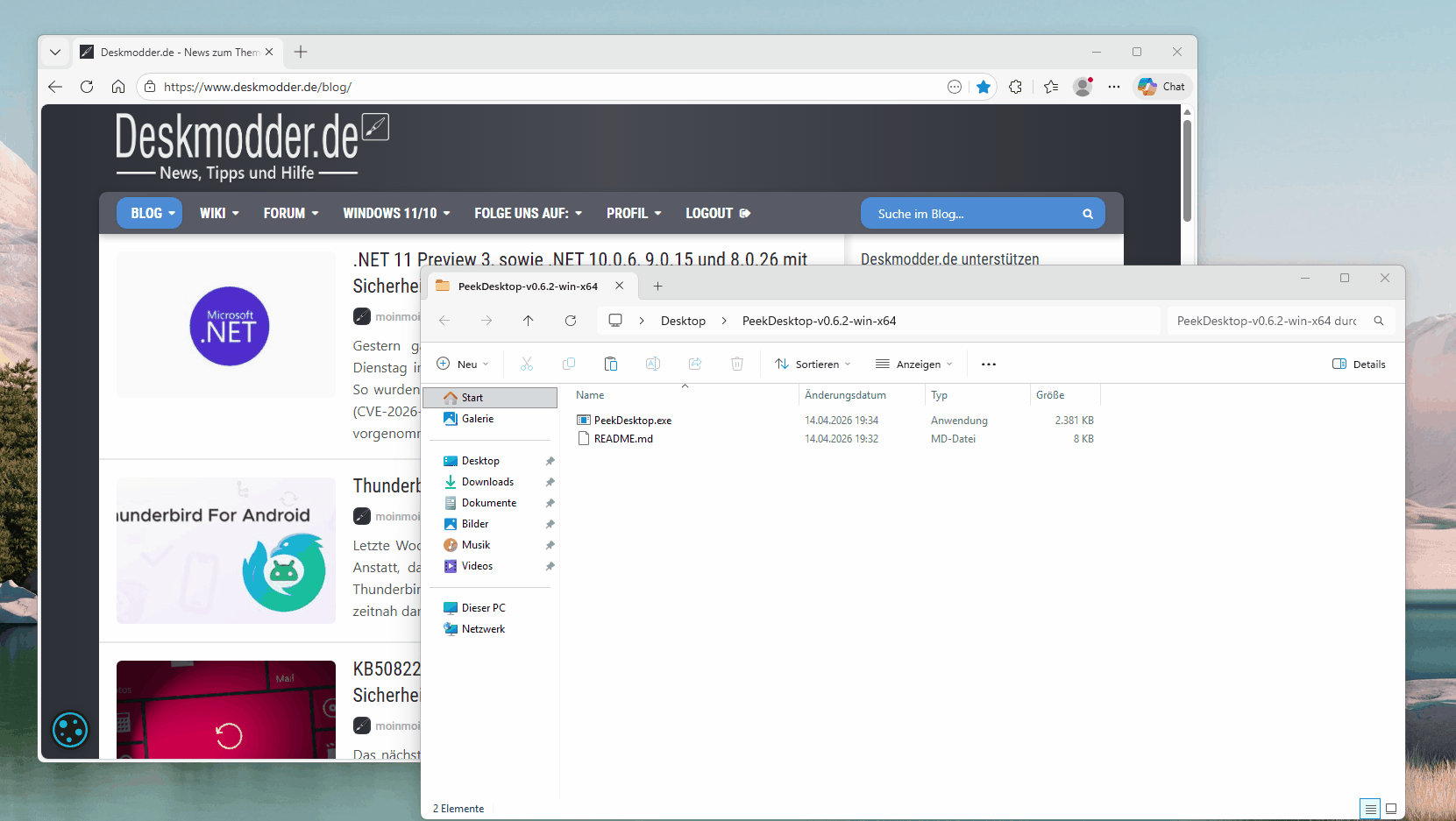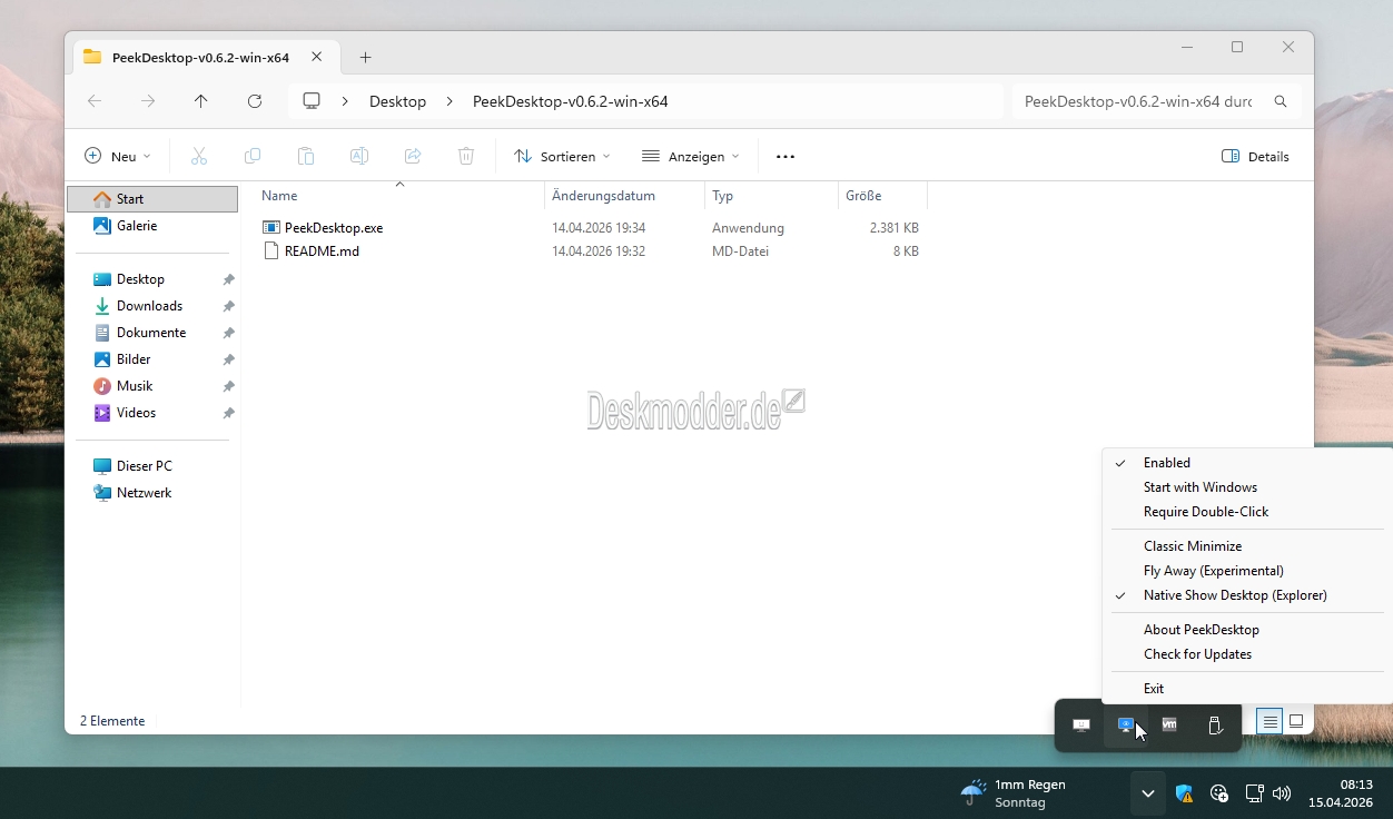 Es ähnelt der Funktion unter macOS Sonoma. Ein Klick auf eine freie Fläche auf dem Desktop lässt alle offenen Fenster auf einmal in die Taskleiste verschwinden oder mit einem weiteren Klick wiederherstellen. Mit einem Rechtsklick auf das Icon im Systray der Taskleiste können dann weitere Funktionen aktiviert werden. So zum Beispiel, dass nur ein Doppelklick die Fenster verschwinden lässt. „Desktop anzeigen“ ganz rechts in der Taskleiste kann aktiviert oder deaktiviert werden.