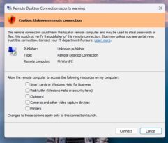 Damit man bessere Informationen bei einer Herstellung der Verbindung bekommt, wird jetzt ein neuer Sicherheitsdialog angezeigt. „Um dem entgegenzuwirken, wird vor dem Herstellen einer Verbindung ein neuer Sicherheitsdialog angezeigt, der die Adresse des Remotecomputers, Informationen zum Herausgeber (sofern verfügbar) sowie alle angeforderten Zugriffsrechte auf lokale Ressourcen anzeigt. Alle angeforderten Einstellungen sind standardmäßig deaktiviert und müssen explizit aktiviert werden. Beim ersten Öffnen einer RDP-Datei wird zudem eine einmalige Sicherheitswarnung angezeigt. Diese Änderung trägt dazu bei, potenziell riskante Verbindungen sichtbarer und bewusster zu machen, ohne Verbindungen zu beeinträchtigen, die manuell in der Remote-Desktop-App gestartet werden.“