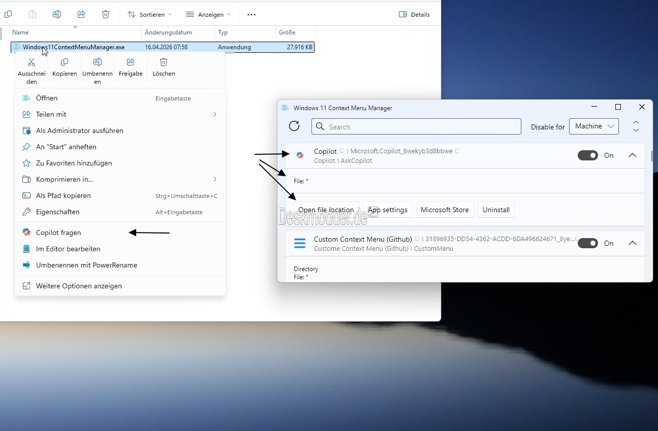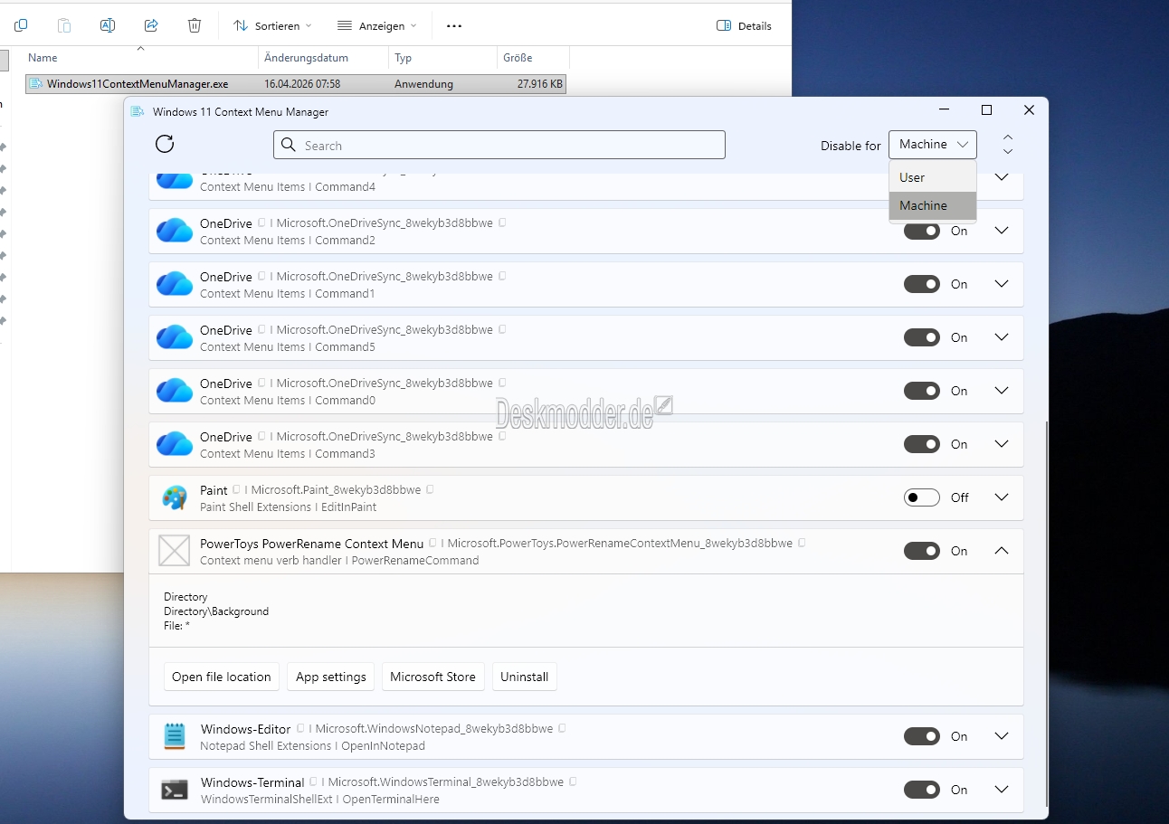 Es geht auch mit dem Windows 11 Context Menu Manager. Dieser zeigt die Einträge an, die in der Registry gespeichert wurden. Startet man die Windows11ContextMenuManager.exe als Administrator, hat man die Auswahl zwischen Benutzer (User) und Alle Benutzer (Machine). Normal gestartet, nur für den einzelnen Benutzer.